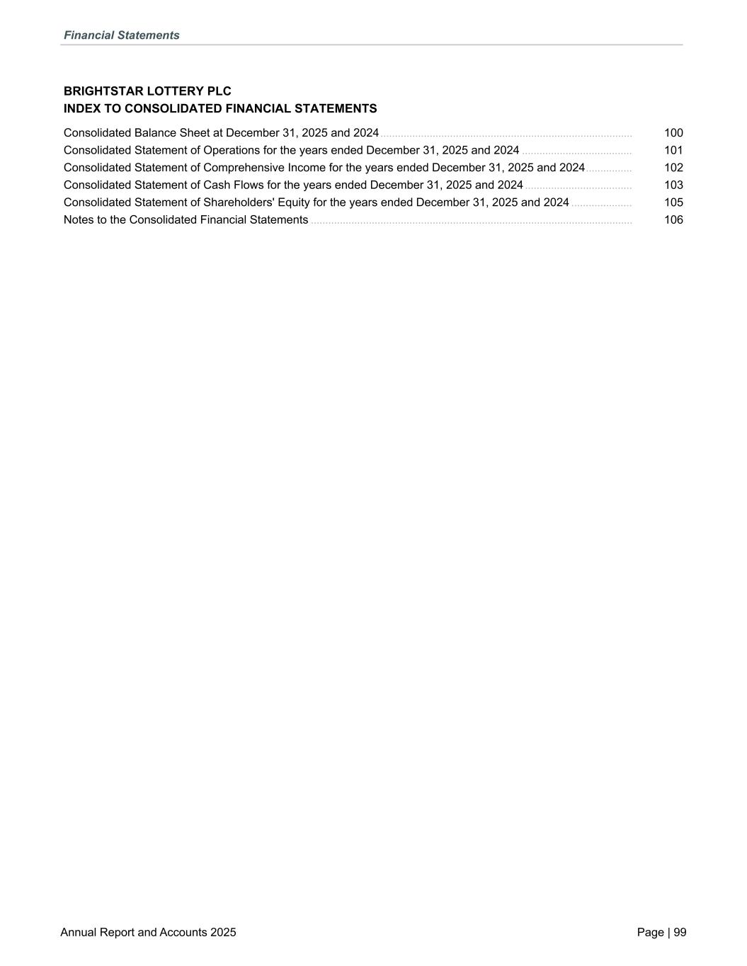 BRIGHTSTAR LOTTERY PLC INDEX TO CONSOLIDATED FINANCIAL STATEMENTS Consolidated Balance Sheet at December 31, 2025 and 2024 ....................................................................................... 100 Consolidated Statement of Operations for the years ended December 31, 2025 and 2024 ...................................... 101 Consolidated Statement of Comprehensive Income for the years ended December 31, 2025 and 2024 ................ 102 Consolidated Statement of Cash Flows for the years ended December 31, 2025 and 2024 ..................................... 103 Consolidated Statement of Shareholders' Equity for the years ended December 31, 2025 and 2024 ..................... 105 Notes to the Consolidated Financial Statements ............................................................................................................... 106 Financial Statements Annual Report and Accounts 2025 Page | 99