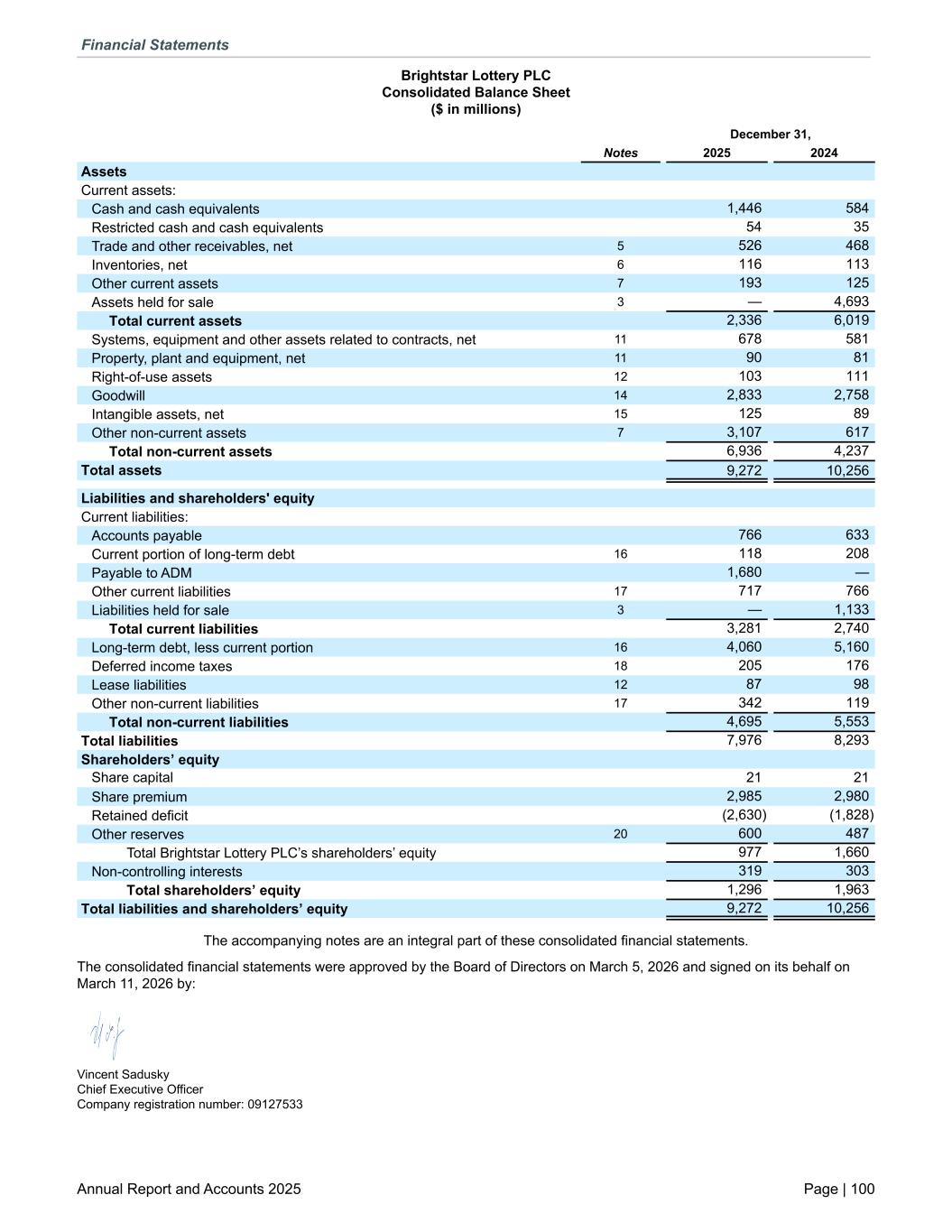 Brightstar Lottery PLC Consolidated Balance Sheet ($ in millions) December 31, Notes 2025 2024 Assets Current assets: Cash and cash equivalents 1,446 584 Restricted cash and cash equivalents 54 35 Trade and other receivables, net 5 526 468 Inventories, net 6 116 113 Other current assets 7 193 125 Assets held for sale 3 — 4,693 Total current assets 2,336 6,019 Systems, equipment and other assets related to contracts, net 11 678 581 Property, plant and equipment, net 11 90 81 Right-of-use assets 12 103 111 Goodwill 14 2,833 2,758 Intangible assets, net 15 125 89 Other non-current assets 7 3,107 617 Total non-current assets 6,936 4,237 Total assets 9,272 10,256 Liabilities and shareholders' equity Current liabilities: Accounts payable 766 633 Current portion of long-term debt 16 118 208 Payable to ADM 1,680 — Other current liabilities 17 717 766 Liabilities held for sale 3 — 1,133 Total current liabilities 3,281 2,740 Long-term debt, less current portion 16 4,060 5,160 Deferred income taxes 18 205 176 Lease liabilities 12 87 98 Other non-current liabilities 17 342 119 Total non-current liabilities 4,695 5,553 Total liabilities 7,976 8,293 Shareholders’ equity Share capital 21 21 Share premium 2,985 2,980 Retained deficit (2,630) (1,828) Other reserves 20 600 487 Total Brightstar Lottery PLC’s shareholders’ equity 977 1,660 Non-controlling interests 319 303 Total shareholders’ equity 1,296 1,963 Total liabilities and shareholders’ equity 9,272 10,256 The accompanying notes are an integral part of these consolidated financial statements. The consolidated financial statements were approved by the Board of Directors on March 5, 2026 and signed on its behalf on March 11, 2026 by: Vincent Sadusky Chief Executive Officer Company registration number: 09127533 Financial Statements Annual Report and Accounts 2025 Page | 100