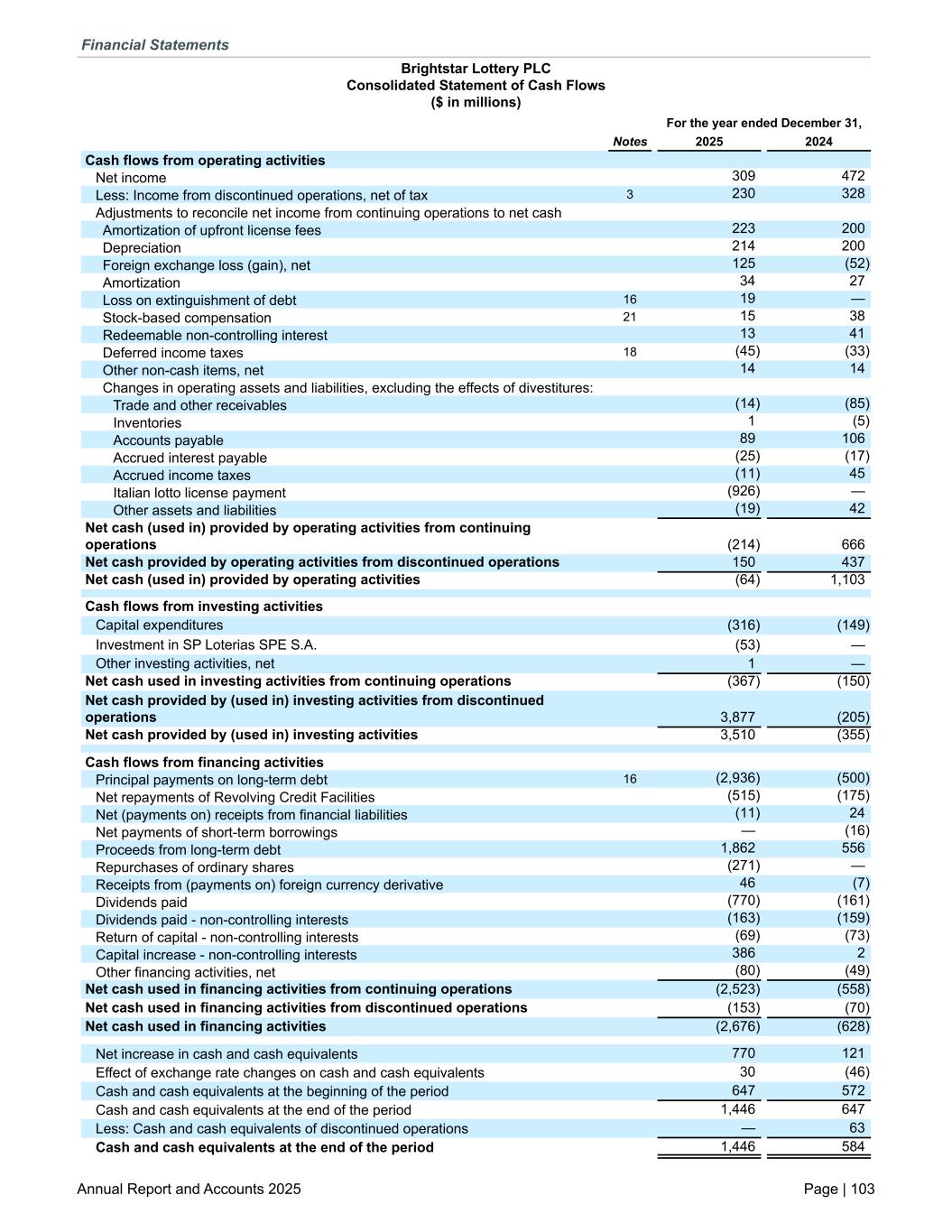 Brightstar Lottery PLC Consolidated Statement of Cash Flows ($ in millions) For the year ended December 31, Notes 2025 2024 Cash flows from operating activities Net income 309 472 Less: Income from discontinued operations, net of tax 3 230 328 Adjustments to reconcile net income from continuing operations to net cash Amortization of upfront license fees 223 200 Depreciation 214 200 Foreign exchange loss (gain), net 125 (52) Amortization 34 27 Loss on extinguishment of debt 16 19 — Stock-based compensation 21 15 38 Redeemable non-controlling interest 13 41 Deferred income taxes 18 (45) (33) Other non-cash items, net 14 14 Changes in operating assets and liabilities, excluding the effects of divestitures: Trade and other receivables (14) (85) Inventories 1 (5) Accounts payable 89 106 Accrued interest payable (25) (17) Accrued income taxes (11) 45 Italian lotto license payment (926) — Other assets and liabilities (19) 42 Net cash (used in) provided by operating activities from continuing operations (214) 666 Net cash provided by operating activities from discontinued operations 150 437 Net cash (used in) provided by operating activities (64) 1,103 Cash flows from investing activities Capital expenditures (316) (149) Investment in SP Loterias SPE S.A. (53) — Other investing activities, net 1 — Net cash used in investing activities from continuing operations (367) (150) Net cash provided by (used in) investing activities from discontinued operations 3,877 (205) Net cash provided by (used in) investing activities 3,510 (355) Cash flows from financing activities Principal payments on long-term debt 16 (2,936) (500) Net repayments of Revolving Credit Facilities (515) (175) Net (payments on) receipts from financial liabilities (11) 24 Net payments of short-term borrowings — (16) Proceeds from long-term debt 1,862 556 Repurchases of ordinary shares (271) — Receipts from (payments on) foreign currency derivative 46 (7) Dividends paid (770) (161) Dividends paid - non-controlling interests (163) (159) Return of capital - non-controlling interests (69) (73) Capital increase - non-controlling interests 386 2 Other financing activities, net (80) (49) Net cash used in financing activities from continuing operations (2,523) (558) Net cash used in financing activities from discontinued operations (153) (70) Net cash used in financing activities (2,676) (628) Net increase in cash and cash equivalents 770 121 Effect of exchange rate changes on cash and cash equivalents 30 (46) Cash and cash equivalents at the beginning of the period 647 572 Cash and cash equivalents at the end of the period 1,446 647 Less: Cash and cash equivalents of discontinued operations — 63 Cash and cash equivalents at the end of the period 1,446 584 Financial Statements Annual Report and Accounts 2025 Page | 103