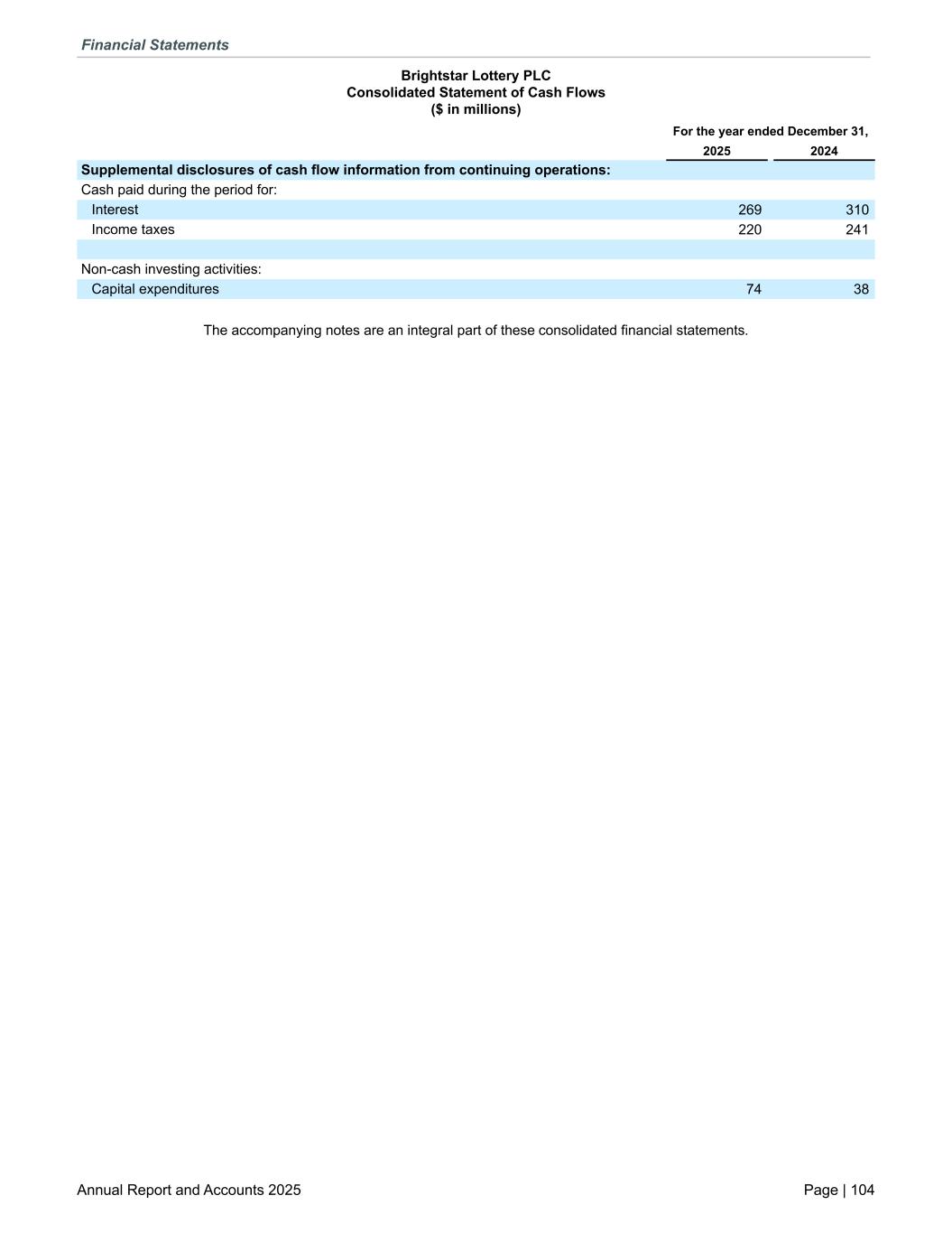 Brightstar Lottery PLC Consolidated Statement of Cash Flows ($ in millions) For the year ended December 31, 2025 2024 Supplemental disclosures of cash flow information from continuing operations: Cash paid during the period for: Interest 269 310 Income taxes 220 241 Non-cash investing activities: Capital expenditures 74 38 The accompanying notes are an integral part of these consolidated financial statements. Financial Statements Annual Report and Accounts 2025 Page | 104