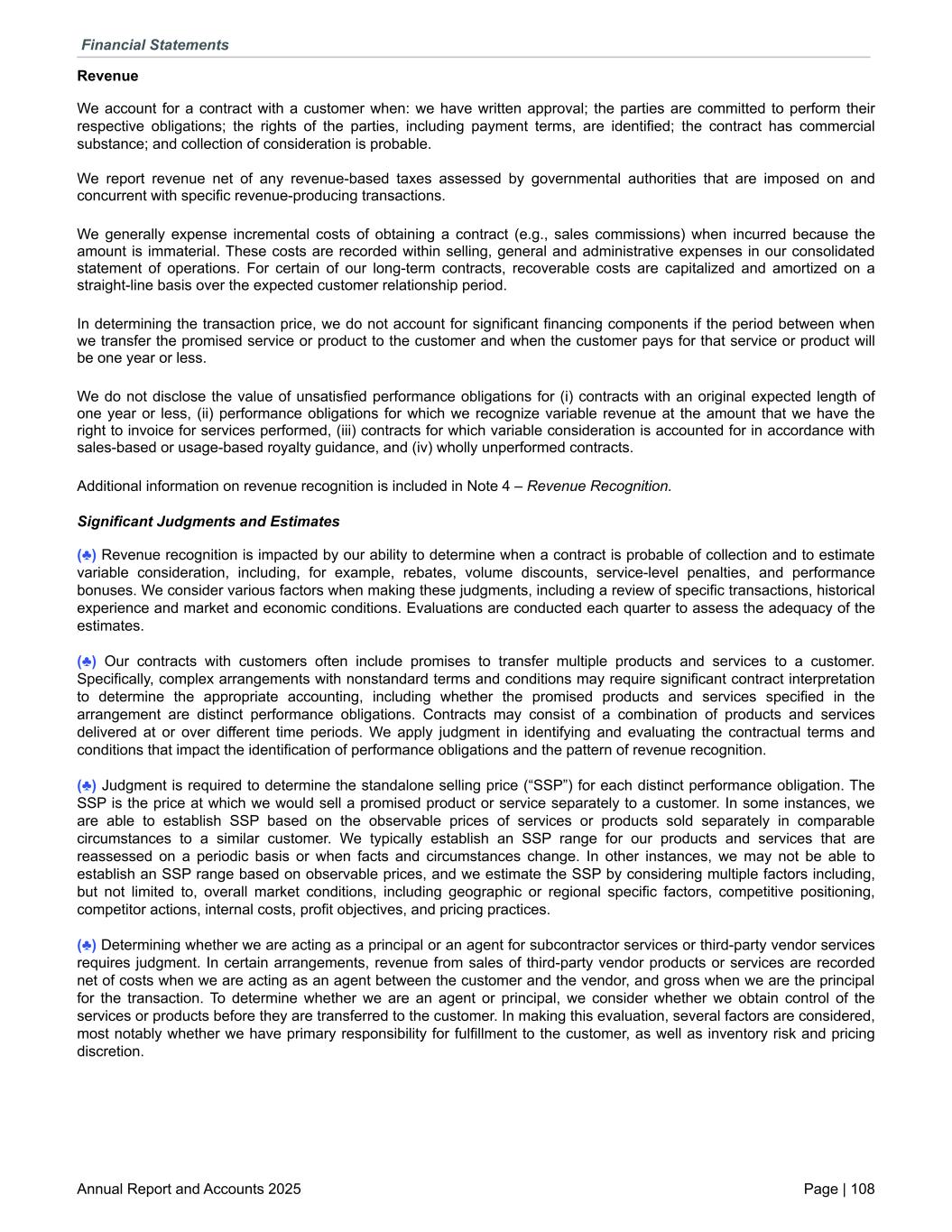 Revenue We account for a contract with a customer when: we have written approval; the parties are committed to perform their respective obligations; the rights of the parties, including payment terms, are identified; the contract has commercial substance; and collection of consideration is probable. We report revenue net of any revenue-based taxes assessed by governmental authorities that are imposed on and concurrent with specific revenue-producing transactions. We generally expense incremental costs of obtaining a contract (e.g., sales commissions) when incurred because the amount is immaterial. These costs are recorded within selling, general and administrative expenses in our consolidated statement of operations. For certain of our long-term contracts, recoverable costs are capitalized and amortized on a straight-line basis over the expected customer relationship period. In determining the transaction price, we do not account for significant financing components if the period between when we transfer the promised service or product to the customer and when the customer pays for that service or product will be one year or less. We do not disclose the value of unsatisfied performance obligations for (i) contracts with an original expected length of one year or less, (ii) performance obligations for which we recognize variable revenue at the amount that we have the right to invoice for services performed, (iii) contracts for which variable consideration is accounted for in accordance with sales-based or usage-based royalty guidance, and (iv) wholly unperformed contracts. Additional information on revenue recognition is included in Note 4 – Revenue Recognition. Significant Judgments and Estimates (♣) Revenue recognition is impacted by our ability to determine when a contract is probable of collection and to estimate variable consideration, including, for example, rebates, volume discounts, service-level penalties, and performance bonuses. We consider various factors when making these judgments, including a review of specific transactions, historical experience and market and economic conditions. Evaluations are conducted each quarter to assess the adequacy of the estimates. (♣) Our contracts with customers often include promises to transfer multiple products and services to a customer. Specifically, complex arrangements with nonstandard terms and conditions may require significant contract interpretation to determine the appropriate accounting, including whether the promised products and services specified in the arrangement are distinct performance obligations. Contracts may consist of a combination of products and services delivered at or over different time periods. We apply judgment in identifying and evaluating the contractual terms and conditions that impact the identification of performance obligations and the pattern of revenue recognition. (♣) Judgment is required to determine the standalone selling price (“SSP”) for each distinct performance obligation. The SSP is the price at which we would sell a promised product or service separately to a customer. In some instances, we are able to establish SSP based on the observable prices of services or products sold separately in comparable circumstances to a similar customer. We typically establish an SSP range for our products and services that are reassessed on a periodic basis or when facts and circumstances change. In other instances, we may not be able to establish an SSP range based on observable prices, and we estimate the SSP by considering multiple factors including, but not limited to, overall market conditions, including geographic or regional specific factors, competitive positioning, competitor actions, internal costs, profit objectives, and pricing practices. (♣) Determining whether we are acting as a principal or an agent for subcontractor services or third-party vendor services requires judgment. In certain arrangements, revenue from sales of third-party vendor products or services are recorded net of costs when we are acting as an agent between the customer and the vendor, and gross when we are the principal for the transaction. To determine whether we are an agent or principal, we consider whether we obtain control of the services or products before they are transferred to the customer. In making this evaluation, several factors are considered, most notably whether we have primary responsibility for fulfillment to the customer, as well as inventory risk and pricing discretion. Financial Statements Annual Report and Accounts 2025 Page | 108