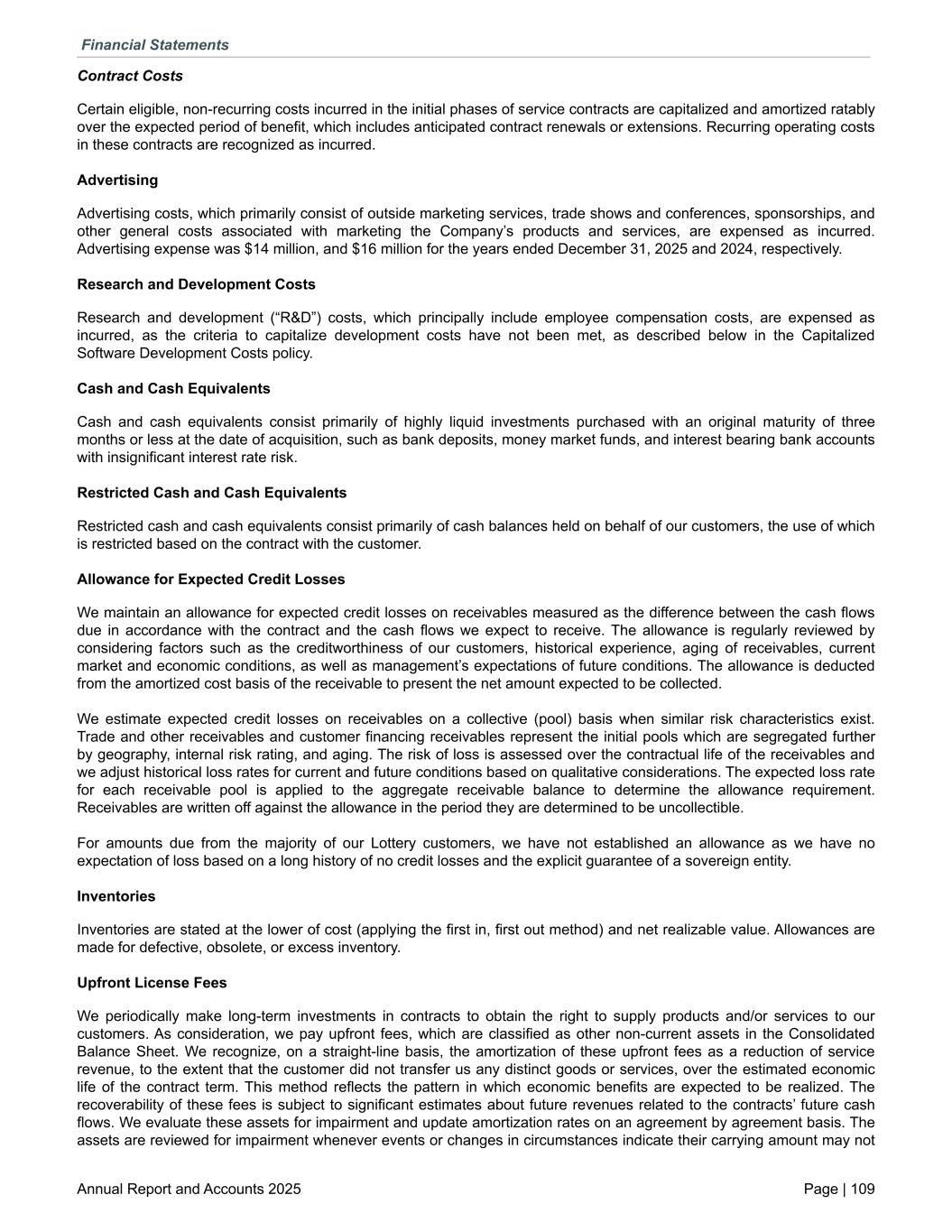 Contract Costs Certain eligible, non-recurring costs incurred in the initial phases of service contracts are capitalized and amortized ratably over the expected period of benefit, which includes anticipated contract renewals or extensions. Recurring operating costs in these contracts are recognized as incurred. Advertising Advertising costs, which primarily consist of outside marketing services, trade shows and conferences, sponsorships, and other general costs associated with marketing the Company’s products and services, are expensed as incurred. Advertising expense was $14 million, and $16 million for the years ended December 31, 2025 and 2024, respectively. Research and Development Costs Research and development (“R&D”) costs, which principally include employee compensation costs, are expensed as incurred, as the criteria to capitalize development costs have not been met, as described below in the Capitalized Software Development Costs policy. Cash and Cash Equivalents Cash and cash equivalents consist primarily of highly liquid investments purchased with an original maturity of three months or less at the date of acquisition, such as bank deposits, money market funds, and interest bearing bank accounts with insignificant interest rate risk. Restricted Cash and Cash Equivalents Restricted cash and cash equivalents consist primarily of cash balances held on behalf of our customers, the use of which is restricted based on the contract with the customer. Allowance for Expected Credit Losses We maintain an allowance for expected credit losses on receivables measured as the difference between the cash flows due in accordance with the contract and the cash flows we expect to receive. The allowance is regularly reviewed by considering factors such as the creditworthiness of our customers, historical experience, aging of receivables, current market and economic conditions, as well as management’s expectations of future conditions. The allowance is deducted from the amortized cost basis of the receivable to present the net amount expected to be collected. We estimate expected credit losses on receivables on a collective (pool) basis when similar risk characteristics exist. Trade and other receivables and customer financing receivables represent the initial pools which are segregated further by geography, internal risk rating, and aging. The risk of loss is assessed over the contractual life of the receivables and we adjust historical loss rates for current and future conditions based on qualitative considerations. The expected loss rate for each receivable pool is applied to the aggregate receivable balance to determine the allowance requirement. Receivables are written off against the allowance in the period they are determined to be uncollectible. For amounts due from the majority of our Lottery customers, we have not established an allowance as we have no expectation of loss based on a long history of no credit losses and the explicit guarantee of a sovereign entity. Inventories Inventories are stated at the lower of cost (applying the first in, first out method) and net realizable value. Allowances are made for defective, obsolete, or excess inventory. Upfront License Fees We periodically make long-term investments in contracts to obtain the right to supply products and/or services to our customers. As consideration, we pay upfront fees, which are classified as other non-current assets in the Consolidated Balance Sheet. We recognize, on a straight-line basis, the amortization of these upfront fees as a reduction of service revenue, to the extent that the customer did not transfer us any distinct goods or services, over the estimated economic life of the contract term. This method reflects the pattern in which economic benefits are expected to be realized. The recoverability of these fees is subject to significant estimates about future revenues related to the contracts’ future cash flows. We evaluate these assets for impairment and update amortization rates on an agreement by agreement basis. The assets are reviewed for impairment whenever events or changes in circumstances indicate their carrying amount may not Financial Statements Annual Report and Accounts 2025 Page | 109