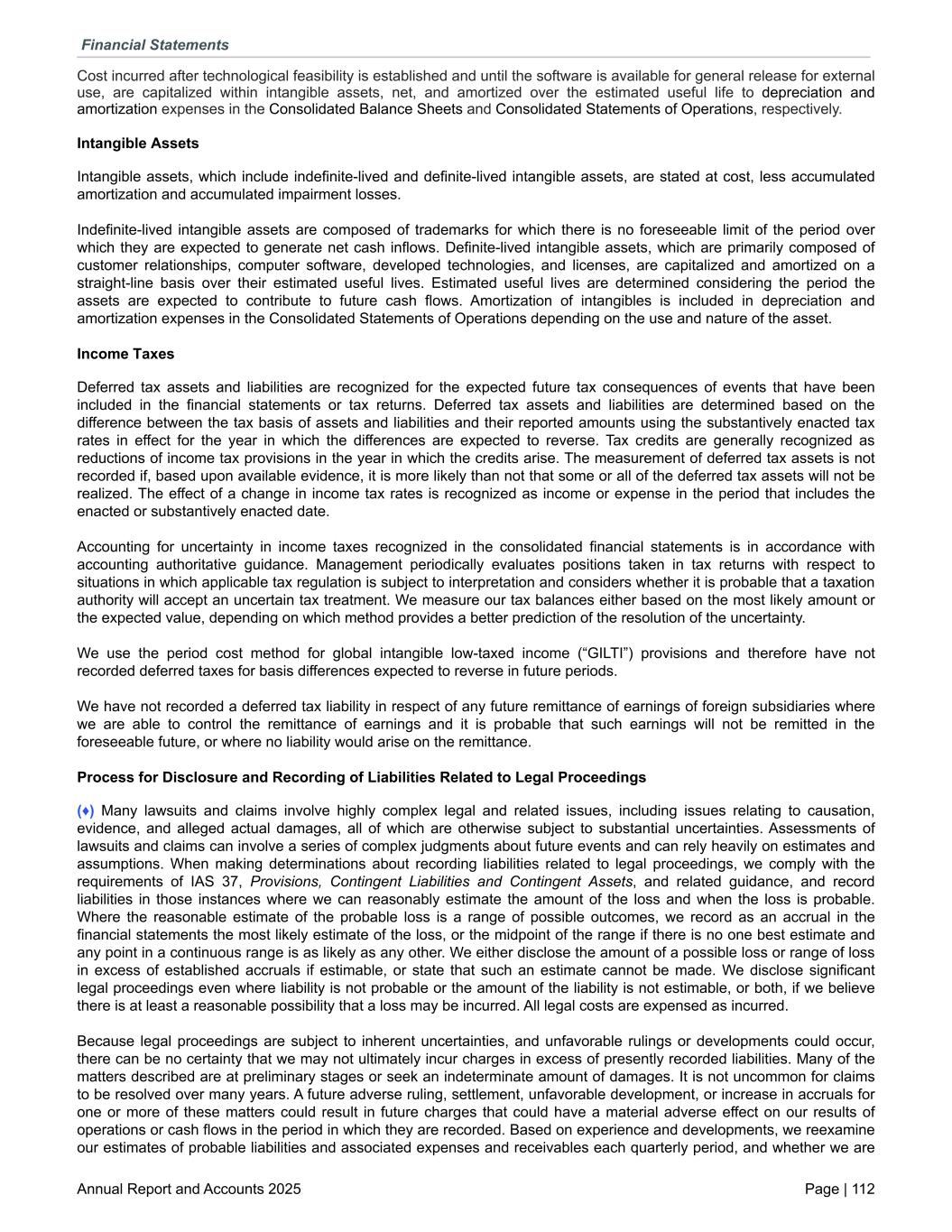 Cost incurred after technological feasibility is established and until the software is available for general release for external use, are capitalized within intangible assets, net, and amortized over the estimated useful life to depreciation and amortization expenses in the Consolidated Balance Sheets and Consolidated Statements of Operations, respectively. Intangible Assets Intangible assets, which include indefinite-lived and definite-lived intangible assets, are stated at cost, less accumulated amortization and accumulated impairment losses. Indefinite-lived intangible assets are composed of trademarks for which there is no foreseeable limit of the period over which they are expected to generate net cash inflows. Definite-lived intangible assets, which are primarily composed of customer relationships, computer software, developed technologies, and licenses, are capitalized and amortized on a straight-line basis over their estimated useful lives. Estimated useful lives are determined considering the period the assets are expected to contribute to future cash flows. Amortization of intangibles is included in depreciation and amortization expenses in the Consolidated Statements of Operations depending on the use and nature of the asset. Income Taxes Deferred tax assets and liabilities are recognized for the expected future tax consequences of events that have been included in the financial statements or tax returns. Deferred tax assets and liabilities are determined based on the difference between the tax basis of assets and liabilities and their reported amounts using the substantively enacted tax rates in effect for the year in which the differences are expected to reverse. Tax credits are generally recognized as reductions of income tax provisions in the year in which the credits arise. The measurement of deferred tax assets is not recorded if, based upon available evidence, it is more likely than not that some or all of the deferred tax assets will not be realized. The effect of a change in income tax rates is recognized as income or expense in the period that includes the enacted or substantively enacted date. Accounting for uncertainty in income taxes recognized in the consolidated financial statements is in accordance with accounting authoritative guidance. Management periodically evaluates positions taken in tax returns with respect to situations in which applicable tax regulation is subject to interpretation and considers whether it is probable that a taxation authority will accept an uncertain tax treatment. We measure our tax balances either based on the most likely amount or the expected value, depending on which method provides a better prediction of the resolution of the uncertainty. We use the period cost method for global intangible low-taxed income (“GILTI”) provisions and therefore have not recorded deferred taxes for basis differences expected to reverse in future periods. We have not recorded a deferred tax liability in respect of any future remittance of earnings of foreign subsidiaries where we are able to control the remittance of earnings and it is probable that such earnings will not be remitted in the foreseeable future, or where no liability would arise on the remittance. Process for Disclosure and Recording of Liabilities Related to Legal Proceedings (♦) Many lawsuits and claims involve highly complex legal and related issues, including issues relating to causation, evidence, and alleged actual damages, all of which are otherwise subject to substantial uncertainties. Assessments of lawsuits and claims can involve a series of complex judgments about future events and can rely heavily on estimates and assumptions. When making determinations about recording liabilities related to legal proceedings, we comply with the requirements of IAS 37, Provisions, Contingent Liabilities and Contingent Assets, and related guidance, and record liabilities in those instances where we can reasonably estimate the amount of the loss and when the loss is probable. Where the reasonable estimate of the probable loss is a range of possible outcomes, we record as an accrual in the financial statements the most likely estimate of the loss, or the midpoint of the range if there is no one best estimate and any point in a continuous range is as likely as any other. We either disclose the amount of a possible loss or range of loss in excess of established accruals if estimable, or state that such an estimate cannot be made. We disclose significant legal proceedings even where liability is not probable or the amount of the liability is not estimable, or both, if we believe there is at least a reasonable possibility that a loss may be incurred. All legal costs are expensed as incurred. Because legal proceedings are subject to inherent uncertainties, and unfavorable rulings or developments could occur, there can be no certainty that we may not ultimately incur charges in excess of presently recorded liabilities. Many of the matters described are at preliminary stages or seek an indeterminate amount of damages. It is not uncommon for claims to be resolved over many years. A future adverse ruling, settlement, unfavorable development, or increase in accruals for one or more of these matters could result in future charges that could have a material adverse effect on our results of operations or cash flows in the period in which they are recorded. Based on experience and developments, we reexamine our estimates of probable liabilities and associated expenses and receivables each quarterly period, and whether we are Financial Statements Annual Report and Accounts 2025 Page | 112