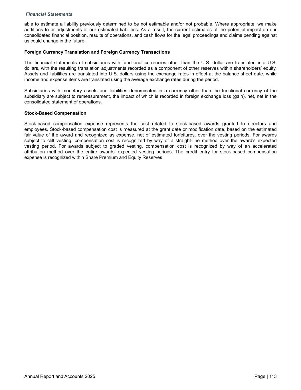 able to estimate a liability previously determined to be not estimable and/or not probable. Where appropriate, we make additions to or adjustments of our estimated liabilities. As a result, the current estimates of the potential impact on our consolidated financial position, results of operations, and cash flows for the legal proceedings and claims pending against us could change in the future. Foreign Currency Translation and Foreign Currency Transactions The financial statements of subsidiaries with functional currencies other than the U.S. dollar are translated into U.S. dollars, with the resulting translation adjustments recorded as a component of other reserves within shareholders’ equity. Assets and liabilities are translated into U.S. dollars using the exchange rates in effect at the balance sheet date, while income and expense items are translated using the average exchange rates during the period. Subsidiaries with monetary assets and liabilities denominated in a currency other than the functional currency of the subsidiary are subject to remeasurement, the impact of which is recorded in foreign exchange loss (gain), net, net in the consolidated statement of operations. Stock-Based Compensation Stock-based compensation expense represents the cost related to stock-based awards granted to directors and employees. Stock-based compensation cost is measured at the grant date or modification date, based on the estimated fair value of the award and recognized as expense, net of estimated forfeitures, over the vesting periods. For awards subject to cliff vesting, compensation cost is recognized by way of a straight-line method over the award’s expected vesting period. For awards subject to graded vesting, compensation cost is recognized by way of an accelerated attribution method over the entire awards’ expected vesting periods. The credit entry for stock-based compensation expense is recognized within Share Premium and Equity Reserves. Financial Statements Annual Report and Accounts 2025 Page | 113