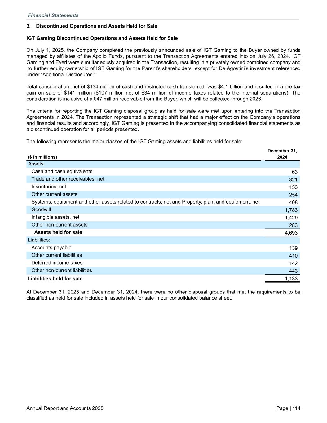 3. Discontinued Operations and Assets Held for Sale IGT Gaming Discontinued Operations and Assets Held for Sale On July 1, 2025, the Company completed the previously announced sale of IGT Gaming to the Buyer owned by funds managed by affiliates of the Apollo Funds, pursuant to the Transaction Agreements entered into on July 26, 2024. IGT Gaming and Everi were simultaneously acquired in the Transaction, resulting in a privately owned combined company and no further equity ownership of IGT Gaming for the Parent’s shareholders, except for De Agostini’s investment referenced under “Additional Disclosures.” Total consideration, net of $134 million of cash and restricted cash transferred, was $4.1 billion and resulted in a pre-tax gain on sale of $141 million ($107 million net of $34 million of income taxes related to the internal separations). The consideration is inclusive of a $47 million receivable from the Buyer, which will be collected through 2026. The criteria for reporting the IGT Gaming disposal group as held for sale were met upon entering into the Transaction Agreements in 2024. The Transaction represented a strategic shift that had a major effect on the Company’s operations and financial results and accordingly, IGT Gaming is presented in the accompanying consolidated financial statements as a discontinued operation for all periods presented. The following represents the major classes of the IGT Gaming assets and liabilities held for sale: December 31, ($ in millions) 2024 Assets: Cash and cash equivalents 63 Trade and other receivables, net 321 Inventories, net 153 Other current assets 254 Systems, equipment and other assets related to contracts, net and Property, plant and equipment, net 408 Goodwill 1,783 Intangible assets, net 1,429 Other non-current assets 283 Assets held for sale 4,693 Liabilities: Accounts payable 139 Other current liabilities 410 Deferred income taxes 142 Other non-current liabilities 443 Liabilities held for sale 1,133 At December 31, 2025 and December 31, 2024, there were no other disposal groups that met the requirements to be classified as held for sale included in assets held for sale in our consolidated balance sheet. Financial Statements Annual Report and Accounts 2025 Page | 114