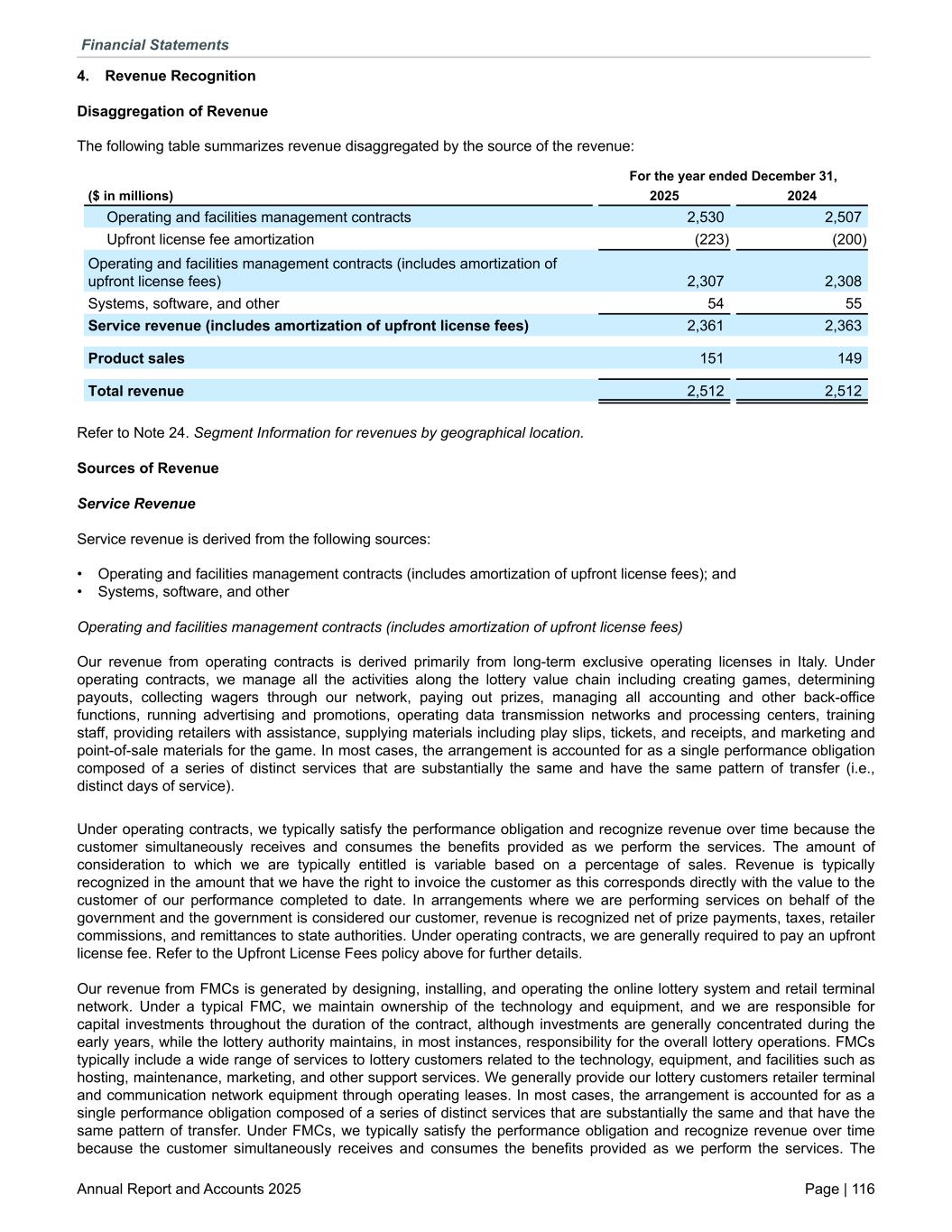 4. Revenue Recognition Disaggregation of Revenue The following table summarizes revenue disaggregated by the source of the revenue: For the year ended December 31, ($ in millions) 2025 2024 Operating and facilities management contracts 2,530 2,507 Upfront license fee amortization (223) (200) Operating and facilities management contracts (includes amortization of upfront license fees) 2,307 2,308 Systems, software, and other 54 55 Service revenue (includes amortization of upfront license fees) 2,361 2,363 Product sales 151 149 Total revenue 2,512 2,512 Refer to Note 24. Segment Information for revenues by geographical location. Sources of Revenue Service Revenue Service revenue is derived from the following sources: • Operating and facilities management contracts (includes amortization of upfront license fees); and • Systems, software, and other Operating and facilities management contracts (includes amortization of upfront license fees) Our revenue from operating contracts is derived primarily from long-term exclusive operating licenses in Italy. Under operating contracts, we manage all the activities along the lottery value chain including creating games, determining payouts, collecting wagers through our network, paying out prizes, managing all accounting and other back-office functions, running advertising and promotions, operating data transmission networks and processing centers, training staff, providing retailers with assistance, supplying materials including play slips, tickets, and receipts, and marketing and point-of-sale materials for the game. In most cases, the arrangement is accounted for as a single performance obligation composed of a series of distinct services that are substantially the same and have the same pattern of transfer (i.e., distinct days of service). Under operating contracts, we typically satisfy the performance obligation and recognize revenue over time because the customer simultaneously receives and consumes the benefits provided as we perform the services. The amount of consideration to which we are typically entitled is variable based on a percentage of sales. Revenue is typically recognized in the amount that we have the right to invoice the customer as this corresponds directly with the value to the customer of our performance completed to date. In arrangements where we are performing services on behalf of the government and the government is considered our customer, revenue is recognized net of prize payments, taxes, retailer commissions, and remittances to state authorities. Under operating contracts, we are generally required to pay an upfront license fee. Refer to the Upfront License Fees policy above for further details. Our revenue from FMCs is generated by designing, installing, and operating the online lottery system and retail terminal network. Under a typical FMC, we maintain ownership of the technology and equipment, and we are responsible for capital investments throughout the duration of the contract, although investments are generally concentrated during the early years, while the lottery authority maintains, in most instances, responsibility for the overall lottery operations. FMCs typically include a wide range of services to lottery customers related to the technology, equipment, and facilities such as hosting, maintenance, marketing, and other support services. We generally provide our lottery customers retailer terminal and communication network equipment through operating leases. In most cases, the arrangement is accounted for as a single performance obligation composed of a series of distinct services that are substantially the same and that have the same pattern of transfer. Under FMCs, we typically satisfy the performance obligation and recognize revenue over time because the customer simultaneously receives and consumes the benefits provided as we perform the services. The Financial Statements Annual Report and Accounts 2025 Page | 116