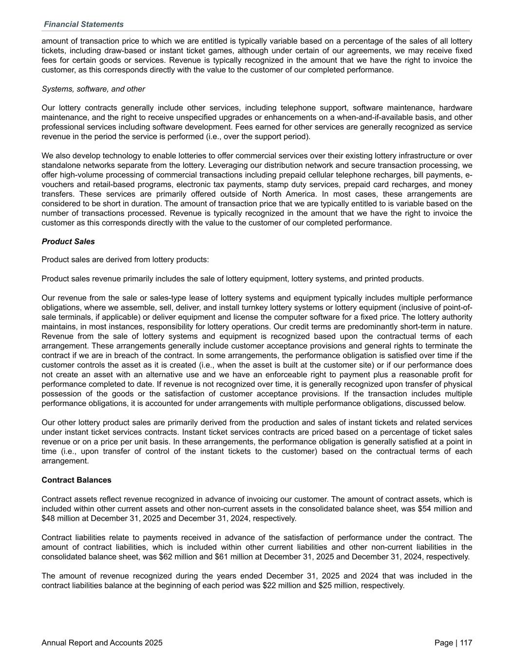 amount of transaction price to which we are entitled is typically variable based on a percentage of the sales of all lottery tickets, including draw-based or instant ticket games, although under certain of our agreements, we may receive fixed fees for certain goods or services. Revenue is typically recognized in the amount that we have the right to invoice the customer, as this corresponds directly with the value to the customer of our completed performance. Systems, software, and other Our lottery contracts generally include other services, including telephone support, software maintenance, hardware maintenance, and the right to receive unspecified upgrades or enhancements on a when-and-if-available basis, and other professional services including software development. Fees earned for other services are generally recognized as service revenue in the period the service is performed (i.e., over the support period). We also develop technology to enable lotteries to offer commercial services over their existing lottery infrastructure or over standalone networks separate from the lottery. Leveraging our distribution network and secure transaction processing, we offer high-volume processing of commercial transactions including prepaid cellular telephone recharges, bill payments, e- vouchers and retail-based programs, electronic tax payments, stamp duty services, prepaid card recharges, and money transfers. These services are primarily offered outside of North America. In most cases, these arrangements are considered to be short in duration. The amount of transaction price that we are typically entitled to is variable based on the number of transactions processed. Revenue is typically recognized in the amount that we have the right to invoice the customer as this corresponds directly with the value to the customer of our completed performance. Product Sales Product sales are derived from lottery products: Product sales revenue primarily includes the sale of lottery equipment, lottery systems, and printed products. Our revenue from the sale or sales-type lease of lottery systems and equipment typically includes multiple performance obligations, where we assemble, sell, deliver, and install turnkey lottery systems or lottery equipment (inclusive of point-of- sale terminals, if applicable) or deliver equipment and license the computer software for a fixed price. The lottery authority maintains, in most instances, responsibility for lottery operations. Our credit terms are predominantly short-term in nature. Revenue from the sale of lottery systems and equipment is recognized based upon the contractual terms of each arrangement. These arrangements generally include customer acceptance provisions and general rights to terminate the contract if we are in breach of the contract. In some arrangements, the performance obligation is satisfied over time if the customer controls the asset as it is created (i.e., when the asset is built at the customer site) or if our performance does not create an asset with an alternative use and we have an enforceable right to payment plus a reasonable profit for performance completed to date. If revenue is not recognized over time, it is generally recognized upon transfer of physical possession of the goods or the satisfaction of customer acceptance provisions. If the transaction includes multiple performance obligations, it is accounted for under arrangements with multiple performance obligations, discussed below. Our other lottery product sales are primarily derived from the production and sales of instant tickets and related services under instant ticket services contracts. Instant ticket services contracts are priced based on a percentage of ticket sales revenue or on a price per unit basis. In these arrangements, the performance obligation is generally satisfied at a point in time (i.e., upon transfer of control of the instant tickets to the customer) based on the contractual terms of each arrangement. Contract Balances Contract assets reflect revenue recognized in advance of invoicing our customer. The amount of contract assets, which is included within other current assets and other non-current assets in the consolidated balance sheet, was $54 million and $48 million at December 31, 2025 and December 31, 2024, respectively. Contract liabilities relate to payments received in advance of the satisfaction of performance under the contract. The amount of contract liabilities, which is included within other current liabilities and other non-current liabilities in the consolidated balance sheet, was $62 million and $61 million at December 31, 2025 and December 31, 2024, respectively. The amount of revenue recognized during the years ended December 31, 2025 and 2024 that was included in the contract liabilities balance at the beginning of each period was $22 million and $25 million, respectively. Financial Statements Annual Report and Accounts 2025 Page | 117
