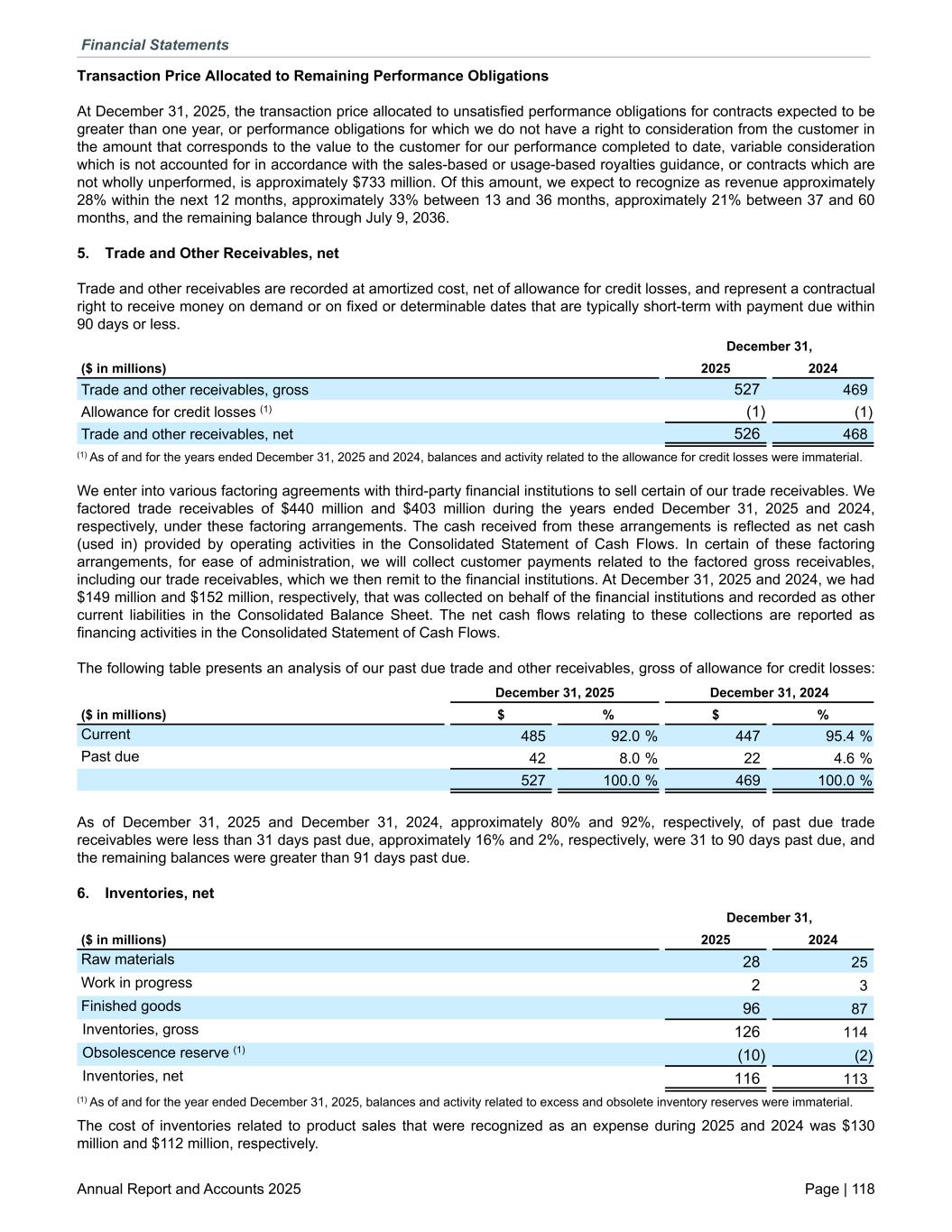 Transaction Price Allocated to Remaining Performance Obligations At December 31, 2025, the transaction price allocated to unsatisfied performance obligations for contracts expected to be greater than one year, or performance obligations for which we do not have a right to consideration from the customer in the amount that corresponds to the value to the customer for our performance completed to date, variable consideration which is not accounted for in accordance with the sales-based or usage-based royalties guidance, or contracts which are not wholly unperformed, is approximately $733 million. Of this amount, we expect to recognize as revenue approximately 28% within the next 12 months, approximately 33% between 13 and 36 months, approximately 21% between 37 and 60 months, and the remaining balance through July 9, 2036. 5. Trade and Other Receivables, net Trade and other receivables are recorded at amortized cost, net of allowance for credit losses, and represent a contractual right to receive money on demand or on fixed or determinable dates that are typically short-term with payment due within 90 days or less. December 31, ($ in millions) 2025 2024 Trade and other receivables, gross 527 469 Allowance for credit losses (1) (1) (1) Trade and other receivables, net 526 468 (1) As of and for the years ended December 31, 2025 and 2024, balances and activity related to the allowance for credit losses were immaterial. We enter into various factoring agreements with third-party financial institutions to sell certain of our trade receivables. We factored trade receivables of $440 million and $403 million during the years ended December 31, 2025 and 2024, respectively, under these factoring arrangements. The cash received from these arrangements is reflected as net cash (used in) provided by operating activities in the Consolidated Statement of Cash Flows. In certain of these factoring arrangements, for ease of administration, we will collect customer payments related to the factored gross receivables, including our trade receivables, which we then remit to the financial institutions. At December 31, 2025 and 2024, we had $149 million and $152 million, respectively, that was collected on behalf of the financial institutions and recorded as other current liabilities in the Consolidated Balance Sheet. The net cash flows relating to these collections are reported as financing activities in the Consolidated Statement of Cash Flows. The following table presents an analysis of our past due trade and other receivables, gross of allowance for credit losses: December 31, 2025 December 31, 2024 ($ in millions) $ % $ % Current 485 92.0 % 447 95.4 % Past due 42 8.0 % 22 4.6 % 527 100.0 % 469 100.0 % As of December 31, 2025 and December 31, 2024, approximately 80% and 92%, respectively, of past due trade receivables were less than 31 days past due, approximately 16% and 2%, respectively, were 31 to 90 days past due, and the remaining balances were greater than 91 days past due. 6. Inventories, net December 31, ($ in millions) 2025 2024 Raw materials 28 25 Work in progress 2 3 Finished goods 96 87 Inventories, gross 126 114 Obsolescence reserve (1) (10) (2) Inventories, net 116 113 (1) As of and for the year ended December 31, 2025, balances and activity related to excess and obsolete inventory reserves were immaterial. The cost of inventories related to product sales that were recognized as an expense during 2025 and 2024 was $130 million and $112 million, respectively. Financial Statements Annual Report and Accounts 2025 Page | 118