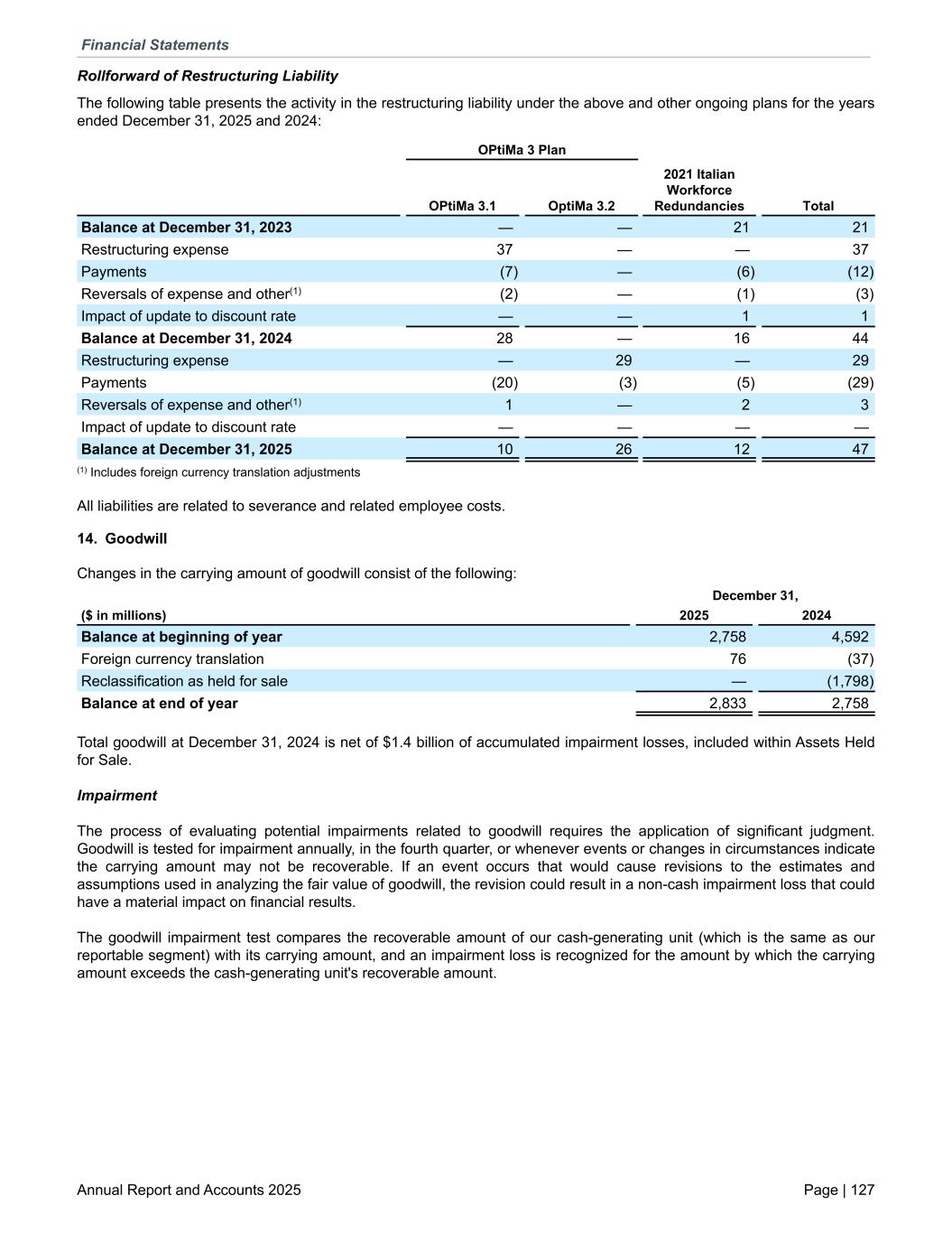 Rollforward of Restructuring Liability The following table presents the activity in the restructuring liability under the above and other ongoing plans for the years ended December 31, 2025 and 2024: OPtiMa 3 Plan OPtiMa 3.1 OptiMa 3.2 2021 Italian Workforce Redundancies Total Balance at December 31, 2023 — — 21 21 Restructuring expense 37 — — 37 Payments (7) — (6) (12) Reversals of expense and other(1) (2) — (1) (3) Impact of update to discount rate — — 1 1 Balance at December 31, 2024 28 — 16 44 Restructuring expense — 29 — 29 Payments (20) (3) (5) (29) Reversals of expense and other(1) 1 — 2 3 Impact of update to discount rate — — — — Balance at December 31, 2025 10 26 12 47 (1) Includes foreign currency translation adjustments All liabilities are related to severance and related employee costs. 14. Goodwill Changes in the carrying amount of goodwill consist of the following: December 31, ($ in millions) 2025 2024 Balance at beginning of year 2,758 4,592 Foreign currency translation 76 (37) Reclassification as held for sale — (1,798) Balance at end of year 2,833 2,758 Total goodwill at December 31, 2024 is net of $1.4 billion of accumulated impairment losses, included within Assets Held for Sale. Impairment The process of evaluating potential impairments related to goodwill requires the application of significant judgment. Goodwill is tested for impairment annually, in the fourth quarter, or whenever events or changes in circumstances indicate the carrying amount may not be recoverable. If an event occurs that would cause revisions to the estimates and assumptions used in analyzing the fair value of goodwill, the revision could result in a non-cash impairment loss that could have a material impact on financial results. The goodwill impairment test compares the recoverable amount of our cash-generating unit (which is the same as our reportable segment) with its carrying amount, and an impairment loss is recognized for the amount by which the carrying amount exceeds the cash-generating unit's recoverable amount. Financial Statements Annual Report and Accounts 2025 Page | 127