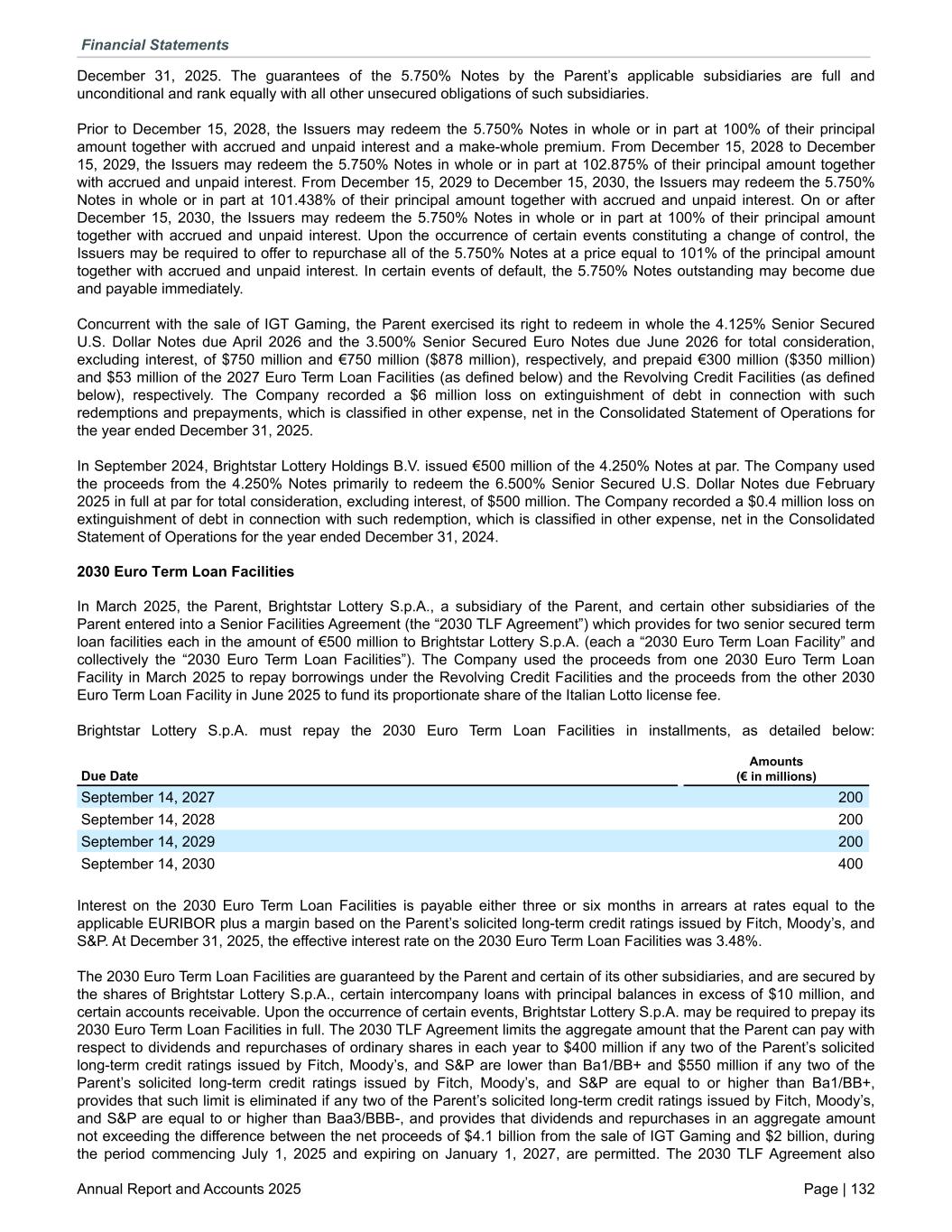 December 31, 2025. The guarantees of the 5.750% Notes by the Parent’s applicable subsidiaries are full and unconditional and rank equally with all other unsecured obligations of such subsidiaries. Prior to December 15, 2028, the Issuers may redeem the 5.750% Notes in whole or in part at 100% of their principal amount together with accrued and unpaid interest and a make-whole premium. From December 15, 2028 to December 15, 2029, the Issuers may redeem the 5.750% Notes in whole or in part at 102.875% of their principal amount together with accrued and unpaid interest. From December 15, 2029 to December 15, 2030, the Issuers may redeem the 5.750% Notes in whole or in part at 101.438% of their principal amount together with accrued and unpaid interest. On or after December 15, 2030, the Issuers may redeem the 5.750% Notes in whole or in part at 100% of their principal amount together with accrued and unpaid interest. Upon the occurrence of certain events constituting a change of control, the Issuers may be required to offer to repurchase all of the 5.750% Notes at a price equal to 101% of the principal amount together with accrued and unpaid interest. In certain events of default, the 5.750% Notes outstanding may become due and payable immediately. Concurrent with the sale of IGT Gaming, the Parent exercised its right to redeem in whole the 4.125% Senior Secured U.S. Dollar Notes due April 2026 and the 3.500% Senior Secured Euro Notes due June 2026 for total consideration, excluding interest, of $750 million and €750 million ($878 million), respectively, and prepaid €300 million ($350 million) and $53 million of the 2027 Euro Term Loan Facilities (as defined below) and the Revolving Credit Facilities (as defined below), respectively. The Company recorded a $6 million loss on extinguishment of debt in connection with such redemptions and prepayments, which is classified in other expense, net in the Consolidated Statement of Operations for the year ended December 31, 2025. In September 2024, Brightstar Lottery Holdings B.V. issued €500 million of the 4.250% Notes at par. The Company used the proceeds from the 4.250% Notes primarily to redeem the 6.500% Senior Secured U.S. Dollar Notes due February 2025 in full at par for total consideration, excluding interest, of $500 million. The Company recorded a $0.4 million loss on extinguishment of debt in connection with such redemption, which is classified in other expense, net in the Consolidated Statement of Operations for the year ended December 31, 2024. 2030 Euro Term Loan Facilities In March 2025, the Parent, Brightstar Lottery S.p.A., a subsidiary of the Parent, and certain other subsidiaries of the Parent entered into a Senior Facilities Agreement (the “2030 TLF Agreement”) which provides for two senior secured term loan facilities each in the amount of €500 million to Brightstar Lottery S.p.A. (each a “2030 Euro Term Loan Facility” and collectively the “2030 Euro Term Loan Facilities”). The Company used the proceeds from one 2030 Euro Term Loan Facility in March 2025 to repay borrowings under the Revolving Credit Facilities and the proceeds from the other 2030 Euro Term Loan Facility in June 2025 to fund its proportionate share of the Italian Lotto license fee. Brightstar Lottery S.p.A. must repay the 2030 Euro Term Loan Facilities in installments, as detailed below: Due Date Amounts (€ in millions) September 14, 2027 200 September 14, 2028 200 September 14, 2029 200 September 14, 2030 400 Interest on the 2030 Euro Term Loan Facilities is payable either three or six months in arrears at rates equal to the applicable EURIBOR plus a margin based on the Parent’s solicited long-term credit ratings issued by Fitch, Moody’s, and S&P. At December 31, 2025, the effective interest rate on the 2030 Euro Term Loan Facilities was 3.48%. The 2030 Euro Term Loan Facilities are guaranteed by the Parent and certain of its other subsidiaries, and are secured by the shares of Brightstar Lottery S.p.A., certain intercompany loans with principal balances in excess of $10 million, and certain accounts receivable. Upon the occurrence of certain events, Brightstar Lottery S.p.A. may be required to prepay its 2030 Euro Term Loan Facilities in full. The 2030 TLF Agreement limits the aggregate amount that the Parent can pay with respect to dividends and repurchases of ordinary shares in each year to $400 million if any two of the Parent’s solicited long-term credit ratings issued by Fitch, Moody’s, and S&P are lower than Ba1/BB+ and $550 million if any two of the Parent’s solicited long-term credit ratings issued by Fitch, Moody’s, and S&P are equal to or higher than Ba1/BB+, provides that such limit is eliminated if any two of the Parent’s solicited long-term credit ratings issued by Fitch, Moody’s, and S&P are equal to or higher than Baa3/BBB-, and provides that dividends and repurchases in an aggregate amount not exceeding the difference between the net proceeds of $4.1 billion from the sale of IGT Gaming and $2 billion, during the period commencing July 1, 2025 and expiring on January 1, 2027, are permitted. The 2030 TLF Agreement also Financial Statements Annual Report and Accounts 2025 Page | 132