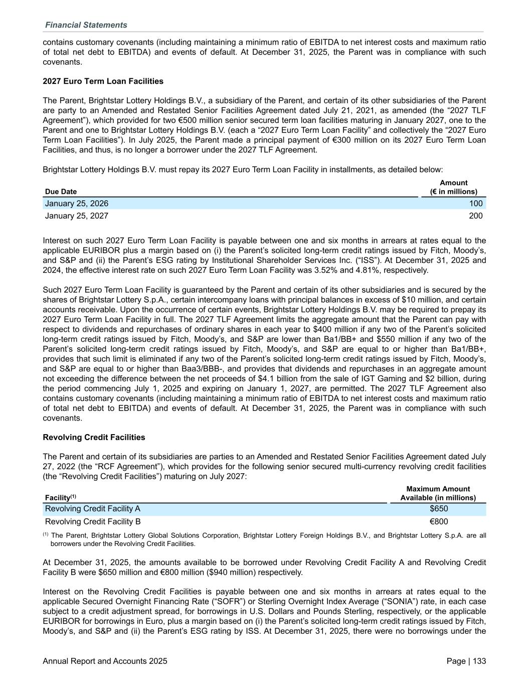 contains customary covenants (including maintaining a minimum ratio of EBITDA to net interest costs and maximum ratio of total net debt to EBITDA) and events of default. At December 31, 2025, the Parent was in compliance with such covenants. 2027 Euro Term Loan Facilities The Parent, Brightstar Lottery Holdings B.V., a subsidiary of the Parent, and certain of its other subsidiaries of the Parent are party to an Amended and Restated Senior Facilities Agreement dated July 21, 2021, as amended (the “2027 TLF Agreement”), which provided for two €500 million senior secured term loan facilities maturing in January 2027, one to the Parent and one to Brightstar Lottery Holdings B.V. (each a “2027 Euro Term Loan Facility” and collectively the “2027 Euro Term Loan Facilities”). In July 2025, the Parent made a principal payment of €300 million on its 2027 Euro Term Loan Facilities, and thus, is no longer a borrower under the 2027 TLF Agreement. Brightstar Lottery Holdings B.V. must repay its 2027 Euro Term Loan Facility in installments, as detailed below: Due Date Amount (€ in millions) January 25, 2026 100 January 25, 2027 200 Interest on such 2027 Euro Term Loan Facility is payable between one and six months in arrears at rates equal to the applicable EURIBOR plus a margin based on (i) the Parent’s solicited long-term credit ratings issued by Fitch, Moody’s, and S&P and (ii) the Parent’s ESG rating by Institutional Shareholder Services Inc. (“ISS”). At December 31, 2025 and 2024, the effective interest rate on such 2027 Euro Term Loan Facility was 3.52% and 4.81%, respectively. Such 2027 Euro Term Loan Facility is guaranteed by the Parent and certain of its other subsidiaries and is secured by the shares of Brightstar Lottery S.p.A., certain intercompany loans with principal balances in excess of $10 million, and certain accounts receivable. Upon the occurrence of certain events, Brightstar Lottery Holdings B.V. may be required to prepay its 2027 Euro Term Loan Facility in full. The 2027 TLF Agreement limits the aggregate amount that the Parent can pay with respect to dividends and repurchases of ordinary shares in each year to $400 million if any two of the Parent’s solicited long-term credit ratings issued by Fitch, Moody’s, and S&P are lower than Ba1/BB+ and $550 million if any two of the Parent’s solicited long-term credit ratings issued by Fitch, Moody’s, and S&P are equal to or higher than Ba1/BB+, provides that such limit is eliminated if any two of the Parent’s solicited long-term credit ratings issued by Fitch, Moody’s, and S&P are equal to or higher than Baa3/BBB-, and provides that dividends and repurchases in an aggregate amount not exceeding the difference between the net proceeds of $4.1 billion from the sale of IGT Gaming and $2 billion, during the period commencing July 1, 2025 and expiring on January 1, 2027, are permitted. The 2027 TLF Agreement also contains customary covenants (including maintaining a minimum ratio of EBITDA to net interest costs and maximum ratio of total net debt to EBITDA) and events of default. At December 31, 2025, the Parent was in compliance with such covenants. Revolving Credit Facilities The Parent and certain of its subsidiaries are parties to an Amended and Restated Senior Facilities Agreement dated July 27, 2022 (the “RCF Agreement”), which provides for the following senior secured multi-currency revolving credit facilities (the “Revolving Credit Facilities”) maturing on July 2027: Facility(1) Maximum Amount Available (in millions) Revolving Credit Facility A $650 Revolving Credit Facility B €800 (1) The Parent, Brightstar Lottery Global Solutions Corporation, Brightstar Lottery Foreign Holdings B.V., and Brightstar Lottery S.p.A. are all borrowers under the Revolving Credit Facilities. At December 31, 2025, the amounts available to be borrowed under Revolving Credit Facility A and Revolving Credit Facility B were $650 million and €800 million ($940 million) respectively. Interest on the Revolving Credit Facilities is payable between one and six months in arrears at rates equal to the applicable Secured Overnight Financing Rate (“SOFR”) or Sterling Overnight Index Average (“SONIA”) rate, in each case subject to a credit adjustment spread, for borrowings in U.S. Dollars and Pounds Sterling, respectively, or the applicable EURIBOR for borrowings in Euro, plus a margin based on (i) the Parent’s solicited long-term credit ratings issued by Fitch, Moody’s, and S&P and (ii) the Parent’s ESG rating by ISS. At December 31, 2025, there were no borrowings under the Financial Statements Annual Report and Accounts 2025 Page | 133