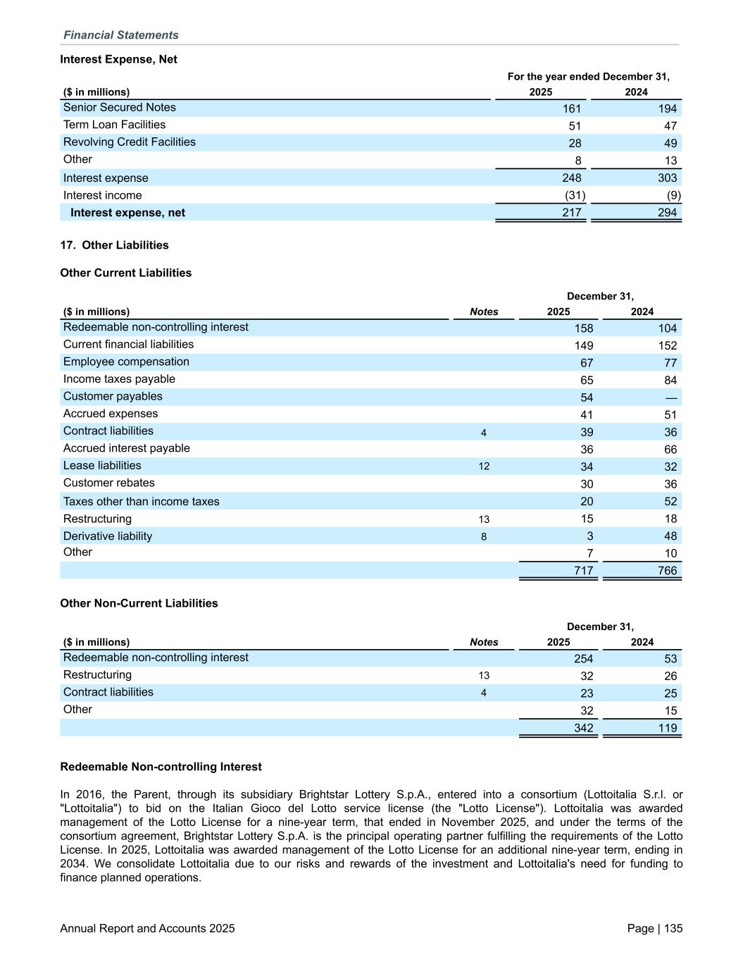 Interest Expense, Net For the year ended December 31, ($ in millions) 2025 2024 Senior Secured Notes 161 194 Term Loan Facilities 51 47 Revolving Credit Facilities 28 49 Other 8 13 Interest expense 248 303 Interest income (31) (9) Interest expense, net 217 294 17. Other Liabilities Other Current Liabilities December 31, ($ in millions) Notes 2025 2024 Redeemable non-controlling interest 158 104 Current financial liabilities 149 152 Employee compensation 67 77 Income taxes payable 65 84 Customer payables 54 — Accrued expenses 41 51 Contract liabilities 4 39 36 Accrued interest payable 36 66 Lease liabilities 12 34 32 Customer rebates 30 36 Taxes other than income taxes 20 52 Restructuring 13 15 18 Derivative liability 8 3 48 Other 7 10 717 766 Other Non-Current Liabilities December 31, ($ in millions) Notes 2025 2024 Redeemable non-controlling interest 254 53 Restructuring 13 32 26 Contract liabilities 4 23 25 Other 32 15 342 119 Redeemable Non-controlling Interest In 2016, the Parent, through its subsidiary Brightstar Lottery S.p.A., entered into a consortium (Lottoitalia S.r.l. or "Lottoitalia") to bid on the Italian Gioco del Lotto service license (the "Lotto License"). Lottoitalia was awarded management of the Lotto License for a nine-year term, that ended in November 2025, and under the terms of the consortium agreement, Brightstar Lottery S.p.A. is the principal operating partner fulfilling the requirements of the Lotto License. In 2025, Lottoitalia was awarded management of the Lotto License for an additional nine-year term, ending in 2034. We consolidate Lottoitalia due to our risks and rewards of the investment and Lottoitalia's need for funding to finance planned operations. Financial Statements Annual Report and Accounts 2025 Page | 135