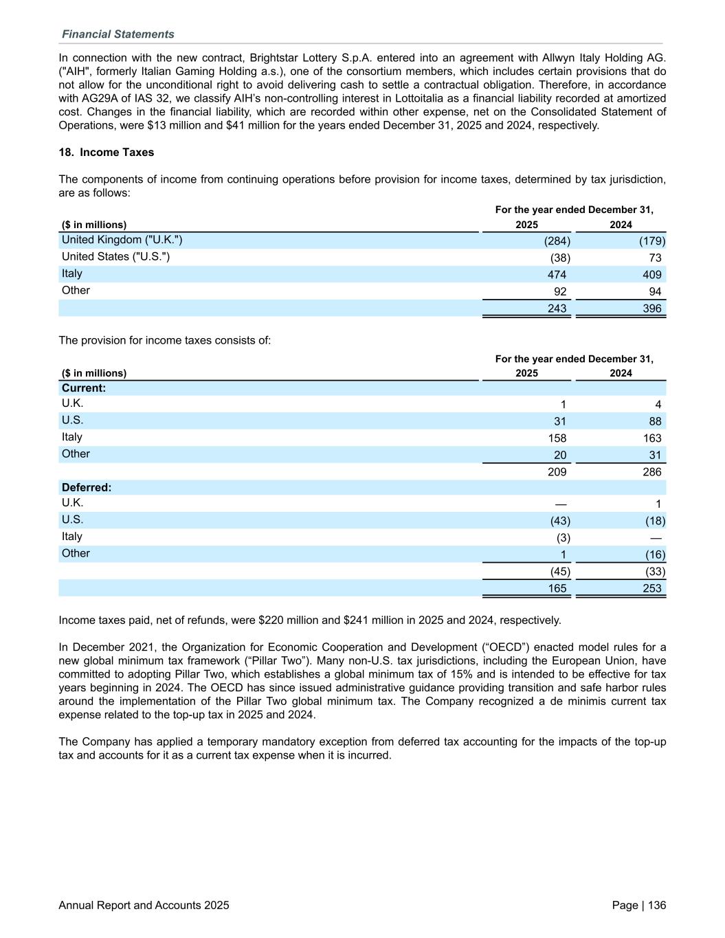 In connection with the new contract, Brightstar Lottery S.p.A. entered into an agreement with Allwyn Italy Holding AG. ("AIH", formerly Italian Gaming Holding a.s.), one of the consortium members, which includes certain provisions that do not allow for the unconditional right to avoid delivering cash to settle a contractual obligation. Therefore, in accordance with AG29A of IAS 32, we classify AIH’s non-controlling interest in Lottoitalia as a financial liability recorded at amortized cost. Changes in the financial liability, which are recorded within other expense, net on the Consolidated Statement of Operations, were $13 million and $41 million for the years ended December 31, 2025 and 2024, respectively. 18. Income Taxes The components of income from continuing operations before provision for income taxes, determined by tax jurisdiction, are as follows: For the year ended December 31, ($ in millions) 2025 2024 United Kingdom ("U.K.") (284) (179) United States ("U.S.") (38) 73 Italy 474 409 Other 92 94 243 396 The provision for income taxes consists of: For the year ended December 31, ($ in millions) 2025 2024 Current: U.K. 1 4 U.S. 31 88 Italy 158 163 Other 20 31 209 286 Deferred: U.K. — 1 U.S. (43) (18) Italy (3) — Other 1 (16) (45) (33) 165 253 Income taxes paid, net of refunds, were $220 million and $241 million in 2025 and 2024, respectively. In December 2021, the Organization for Economic Cooperation and Development (“OECD”) enacted model rules for a new global minimum tax framework (“Pillar Two”). Many non-U.S. tax jurisdictions, including the European Union, have committed to adopting Pillar Two, which establishes a global minimum tax of 15% and is intended to be effective for tax years beginning in 2024. The OECD has since issued administrative guidance providing transition and safe harbor rules around the implementation of the Pillar Two global minimum tax. The Company recognized a de minimis current tax expense related to the top-up tax in 2025 and 2024. The Company has applied a temporary mandatory exception from deferred tax accounting for the impacts of the top-up tax and accounts for it as a current tax expense when it is incurred. Financial Statements Annual Report and Accounts 2025 Page | 136