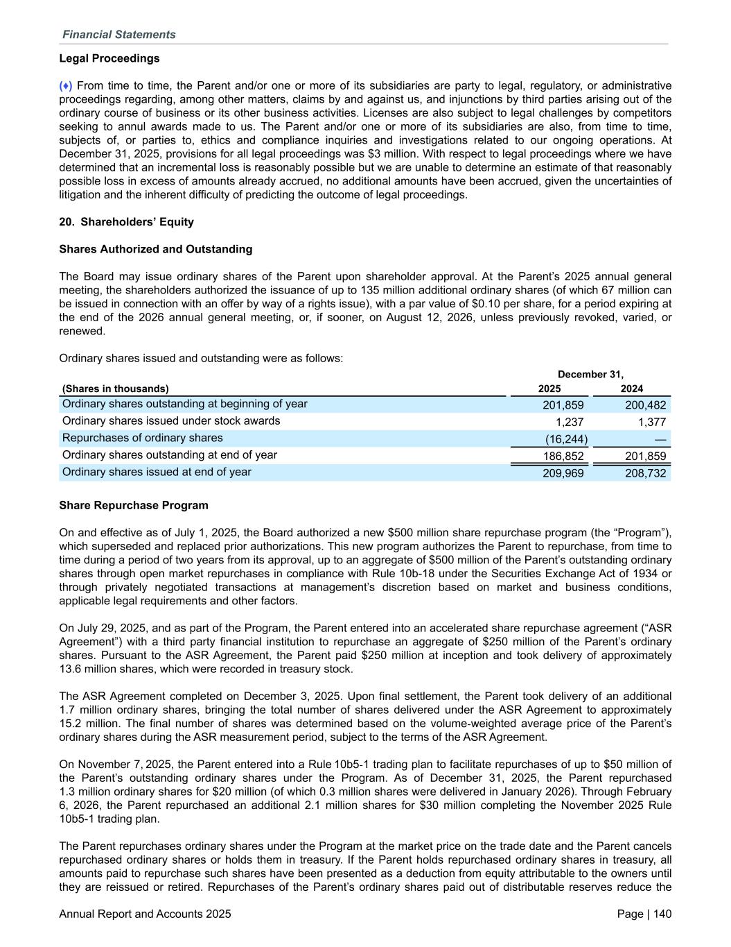 Legal Proceedings (♦) From time to time, the Parent and/or one or more of its subsidiaries are party to legal, regulatory, or administrative proceedings regarding, among other matters, claims by and against us, and injunctions by third parties arising out of the ordinary course of business or its other business activities. Licenses are also subject to legal challenges by competitors seeking to annul awards made to us. The Parent and/or one or more of its subsidiaries are also, from time to time, subjects of, or parties to, ethics and compliance inquiries and investigations related to our ongoing operations. At December 31, 2025, provisions for all legal proceedings was $3 million. With respect to legal proceedings where we have determined that an incremental loss is reasonably possible but we are unable to determine an estimate of that reasonably possible loss in excess of amounts already accrued, no additional amounts have been accrued, given the uncertainties of litigation and the inherent difficulty of predicting the outcome of legal proceedings. 20. Shareholders’ Equity Shares Authorized and Outstanding The Board may issue ordinary shares of the Parent upon shareholder approval. At the Parent’s 2025 annual general meeting, the shareholders authorized the issuance of up to 135 million additional ordinary shares (of which 67 million can be issued in connection with an offer by way of a rights issue), with a par value of $0.10 per share, for a period expiring at the end of the 2026 annual general meeting, or, if sooner, on August 12, 2026, unless previously revoked, varied, or renewed. Ordinary shares issued and outstanding were as follows: December 31, (Shares in thousands) 2025 2024 Ordinary shares outstanding at beginning of year 201,859 200,482 Ordinary shares issued under stock awards 1,237 1,377 Repurchases of ordinary shares (16,244) — Ordinary shares outstanding at end of year 186,852 201,859 Ordinary shares issued at end of year 209,969 208,732 Share Repurchase Program On and effective as of July 1, 2025, the Board authorized a new $500 million share repurchase program (the “Program”), which superseded and replaced prior authorizations. This new program authorizes the Parent to repurchase, from time to time during a period of two years from its approval, up to an aggregate of $500 million of the Parent’s outstanding ordinary shares through open market repurchases in compliance with Rule 10b-18 under the Securities Exchange Act of 1934 or through privately negotiated transactions at management’s discretion based on market and business conditions, applicable legal requirements and other factors. On July 29, 2025, and as part of the Program, the Parent entered into an accelerated share repurchase agreement (“ASR Agreement”) with a third party financial institution to repurchase an aggregate of $250 million of the Parent’s ordinary shares. Pursuant to the ASR Agreement, the Parent paid $250 million at inception and took delivery of approximately 13.6 million shares, which were recorded in treasury stock. The ASR Agreement completed on December 3, 2025. Upon final settlement, the Parent took delivery of an additional 1.7 million ordinary shares, bringing the total number of shares delivered under the ASR Agreement to approximately 15.2 million. The final number of shares was determined based on the volume-weighted average price of the Parent’s ordinary shares during the ASR measurement period, subject to the terms of the ASR Agreement. On November 7, 2025, the Parent entered into a Rule 10b5-1 trading plan to facilitate repurchases of up to $50 million of the Parent’s outstanding ordinary shares under the Program. As of December 31, 2025, the Parent repurchased 1.3 million ordinary shares for $20 million (of which 0.3 million shares were delivered in January 2026). Through February 6, 2026, the Parent repurchased an additional 2.1 million shares for $30 million completing the November 2025 Rule 10b5-1 trading plan. The Parent repurchases ordinary shares under the Program at the market price on the trade date and the Parent cancels repurchased ordinary shares or holds them in treasury. If the Parent holds repurchased ordinary shares in treasury, all amounts paid to repurchase such shares have been presented as a deduction from equity attributable to the owners until they are reissued or retired. Repurchases of the Parent’s ordinary shares paid out of distributable reserves reduce the Financial Statements Annual Report and Accounts 2025 Page | 140