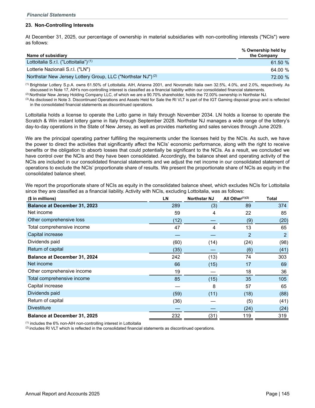 23. Non-Controlling Interests At December 31, 2025, our percentage of ownership in material subsidiaries with non-controlling interests ("NCIs") were as follows: Name of subsidiary % Ownership held by the Company Lottoitalia S.r.l. (”Lottoitalia”) (1) 61.50 % Lotterie Nazionali S.r.l. ("LN") 64.00 % Northstar New Jersey Lottery Group, LLC ("Northstar NJ") (2) 72.00 % (1) Brightstar Lottery S.p.A. owns 61.50% of Lottoitalia. AIH, Arianna 2001, and Novomatic Italia own 32.5%, 4.0%, and 2.0%, respectively. As discussed in Note 17, AIH’s non-controlling interest is classified as a financial liability within our consolidated financial statements. (2) Northstar New Jersey Holding Company LLC, of which we are a 90.70% shareholder, holds the 72.00% ownership in Northstar NJ. (3) As disclosed in Note 3. Discontinued Operations and Assets Held for Sale the RI VLT is part of the IGT Gaming disposal group and is reflected in the consolidated financial statements as discontinued operations. Lottoitalia holds a license to operate the Lotto game in Italy through November 2034. LN holds a license to operate the Scratch & Win instant lottery game in Italy through September 2028. Northstar NJ manages a wide range of the lottery’s day-to-day operations in the State of New Jersey, as well as provides marketing and sales services through June 2029. We are the principal operating partner fulfilling the requirements under the licenses held by the NCIs. As such, we have the power to direct the activities that significantly affect the NCIs’ economic performance, along with the right to receive benefits or the obligation to absorb losses that could potentially be significant to the NCIs. As a result, we concluded we have control over the NCIs and they have been consolidated. Accordingly, the balance sheet and operating activity of the NCIs are included in our consolidated financial statements and we adjust the net income in our consolidated statement of operations to exclude the NCIs’ proportionate share of results. We present the proportionate share of NCIs as equity in the consolidated balance sheet. We report the proportionate share of NCIs as equity in the consolidated balance sheet, which excludes NCIs for Lottoitalia since they are classified as a financial liability. Activity with NCIs, excluding Lottoitalia, was as follows: ($ in millions) LN Northstar NJ All Other(1)(2) Total Balance at December 31, 2023 289 (3) 89 374 Net income 59 4 22 85 Other comprehensive loss (12) — (9) (20) Total comprehensive income 47 4 13 65 Capital increase — — 2 2 Dividends paid (60) (14) (24) (98) Return of capital (35) — (6) (41) Balance at December 31, 2024 242 (13) 74 303 Net income 66 (15) 17 69 Other comprehensive income 19 — 18 36 Total comprehensive income 85 (15) 35 105 Capital increase — 8 57 65 Dividends paid (59) (11) (18) (88) Return of capital (36) — (5) (41) Divestiture — — (24) (24) Balance at December 31, 2025 232 (31) 119 319 (1) includes the 6% non-AIH non-controlling interest in Lottoitalia (2) includes RI VLT which is reflected in the consolidated financial statements as discontinued operations. Financial Statements Annual Report and Accounts 2025 Page | 145