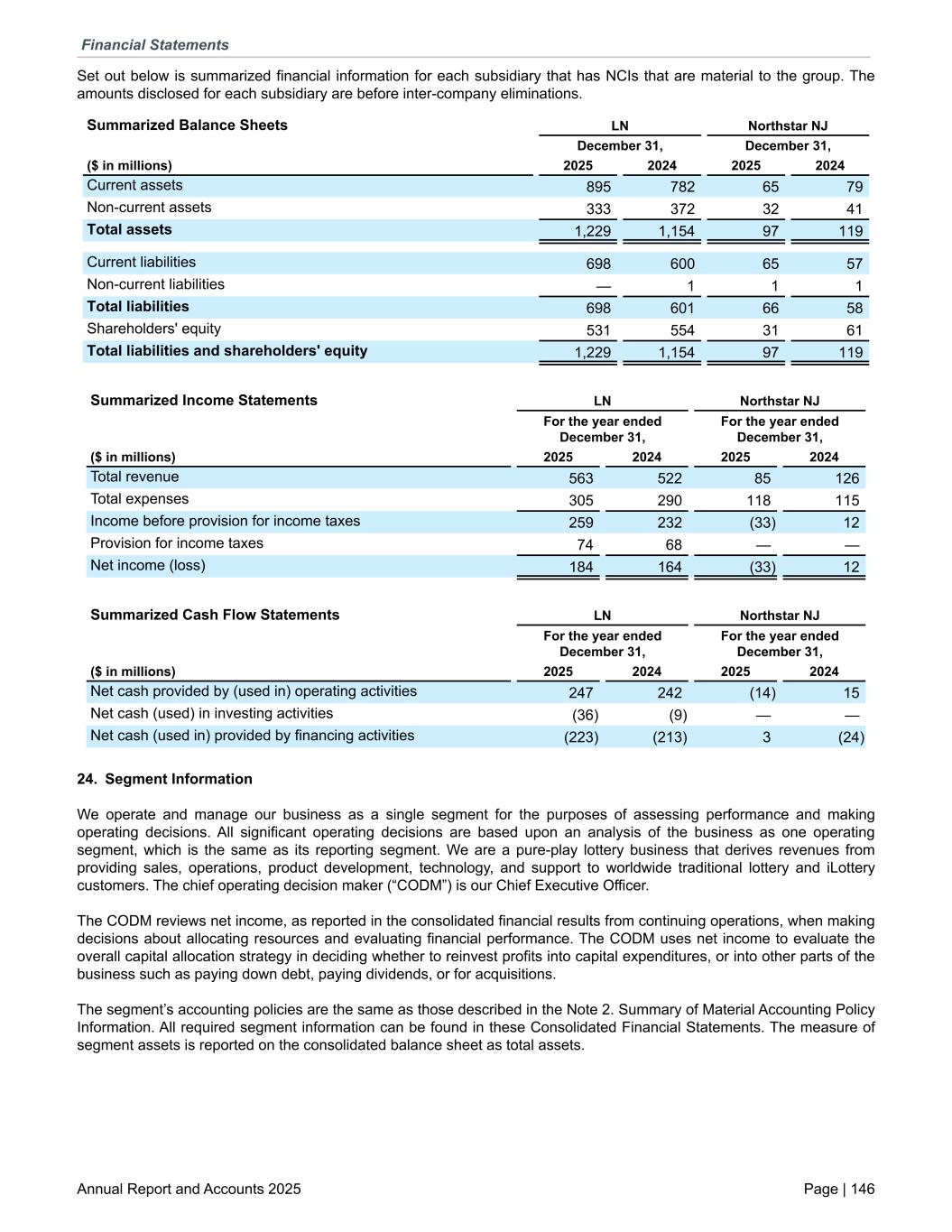 Set out below is summarized financial information for each subsidiary that has NCIs that are material to the group. The amounts disclosed for each subsidiary are before inter-company eliminations. Summarized Balance Sheets LN Northstar NJ December 31, December 31, ($ in millions) 2025 2024 2025 2024 Current assets 895 782 65 79 Non-current assets 333 372 32 41 Total assets 1,229 1,154 97 119 Current liabilities 698 600 65 57 Non-current liabilities — 1 1 1 Total liabilities 698 601 66 58 Shareholders' equity 531 554 31 61 Total liabilities and shareholders' equity 1,229 1,154 97 119 Summarized Income Statements LN Northstar NJ For the year ended December 31, For the year ended December 31, ($ in millions) 2025 2024 2025 2024 Total revenue 563 522 85 126 Total expenses 305 290 118 115 Income before provision for income taxes 259 232 (33) 12 Provision for income taxes 74 68 — — Net income (loss) 184 164 (33) 12 Summarized Cash Flow Statements LN Northstar NJ For the year ended December 31, For the year ended December 31, ($ in millions) 2025 2024 2025 2024 Net cash provided by (used in) operating activities 247 242 (14) 15 Net cash (used) in investing activities (36) (9) — — Net cash (used in) provided by financing activities (223) (213) 3 (24) 24. Segment Information We operate and manage our business as a single segment for the purposes of assessing performance and making operating decisions. All significant operating decisions are based upon an analysis of the business as one operating segment, which is the same as its reporting segment. We are a pure-play lottery business that derives revenues from providing sales, operations, product development, technology, and support to worldwide traditional lottery and iLottery customers. The chief operating decision maker (“CODM”) is our Chief Executive Officer. The CODM reviews net income, as reported in the consolidated financial results from continuing operations, when making decisions about allocating resources and evaluating financial performance. The CODM uses net income to evaluate the overall capital allocation strategy in deciding whether to reinvest profits into capital expenditures, or into other parts of the business such as paying down debt, paying dividends, or for acquisitions. The segment’s accounting policies are the same as those described in the Note 2. Summary of Material Accounting Policy Information. All required segment information can be found in these Consolidated Financial Statements. The measure of segment assets is reported on the consolidated balance sheet as total assets. Financial Statements Annual Report and Accounts 2025 Page | 146