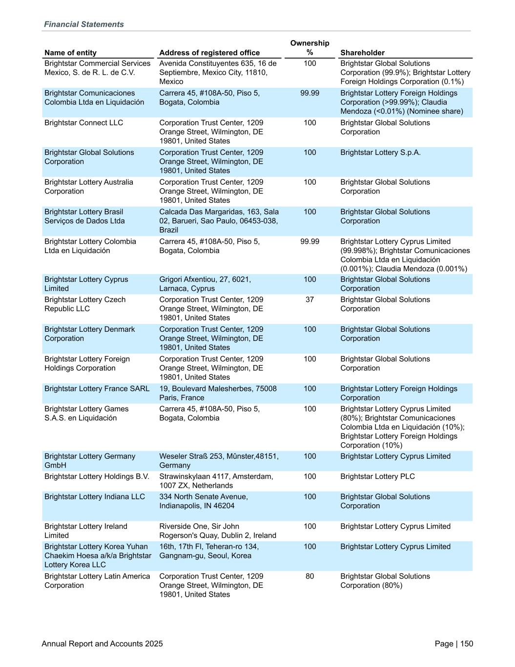 Brightstar Commercial Services Mexico, S. de R. L. de C.V. Avenida Constituyentes 635, 16 de Septiembre, Mexico City, 11810, Mexico 100 Brightstar Global Solutions Corporation (99.9%); Brightstar Lottery Foreign Holdings Corporation (0.1%) Brightstar Comunicaciones Colombia Ltda en Liquidación Carrera 45, #108A-50, Piso 5, Bogata, Colombia 99.99 Brightstar Lottery Foreign Holdings Corporation (>99.99%); Claudia Mendoza (<0.01%) (Nominee share) Brightstar Connect LLC Corporation Trust Center, 1209 Orange Street, Wilmington, DE 19801, United States 100 Brightstar Global Solutions Corporation Brightstar Global Solutions Corporation Corporation Trust Center, 1209 Orange Street, Wilmington, DE 19801, United States 100 Brightstar Lottery S.p.A. Brightstar Lottery Australia Corporation Corporation Trust Center, 1209 Orange Street, Wilmington, DE 19801, United States 100 Brightstar Global Solutions Corporation Brightstar Lottery Brasil Serviços de Dados Ltda Calcada Das Margaridas, 163, Sala 02, Barueri, Sao Paulo, 06453-038, Brazil 100 Brightstar Global Solutions Corporation Brightstar Lottery Colombia Ltda en Liquidación Carrera 45, #108A-50, Piso 5, Bogata, Colombia 99.99 Brightstar Lottery Cyprus Limited (99.998%); Brightstar Comunicaciones Colombia Ltda en Liquidación (0.001%); Claudia Mendoza (0.001%) Brightstar Lottery Cyprus Limited Grigori Afxentiou, 27, 6021, Larnaca, Cyprus 100 Brightstar Global Solutions Corporation Brightstar Lottery Czech Republic LLC Corporation Trust Center, 1209 Orange Street, Wilmington, DE 19801, United States 37 Brightstar Global Solutions Corporation Brightstar Lottery Denmark Corporation Corporation Trust Center, 1209 Orange Street, Wilmington, DE 19801, United States 100 Brightstar Global Solutions Corporation Brightstar Lottery Foreign Holdings Corporation Corporation Trust Center, 1209 Orange Street, Wilmington, DE 19801, United States 100 Brightstar Global Solutions Corporation Brightstar Lottery France SARL 19, Boulevard Malesherbes, 75008 Paris, France 100 Brightstar Lottery Foreign Holdings Corporation Brightstar Lottery Games S.A.S. en Liquidación Carrera 45, #108A-50, Piso 5, Bogata, Colombia 100 Brightstar Lottery Cyprus Limited (80%); Brightstar Comunicaciones Colombia Ltda en Liquidación (10%); Brightstar Lottery Foreign Holdings Corporation (10%) Brightstar Lottery Germany GmbH Weseler Straß 253, Mûnster,48151, Germany 100 Brightstar Lottery Cyprus Limited Brightstar Lottery Holdings B.V. Strawinskylaan 4117, Amsterdam, 1007 ZX, Netherlands 100 Brightstar Lottery PLC Brightstar Lottery Indiana LLC 334 North Senate Avenue, Indianapolis, IN 46204 100 Brightstar Global Solutions Corporation Brightstar Lottery Ireland Limited Riverside One, Sir John Rogerson's Quay, Dublin 2, Ireland 100 Brightstar Lottery Cyprus Limited Brightstar Lottery Korea Yuhan Chaekim Hoesa a/k/a Brightstar Lottery Korea LLC 16th, 17th Fl, Teheran-ro 134, Gangnam-gu, Seoul, Korea 100 Brightstar Lottery Cyprus Limited Brightstar Lottery Latin America Corporation Corporation Trust Center, 1209 Orange Street, Wilmington, DE 19801, United States 80 Brightstar Global Solutions Corporation (80%) Name of entity Address of registered office Ownership % Shareholder Financial Statements Annual Report and Accounts 2025 Page | 150