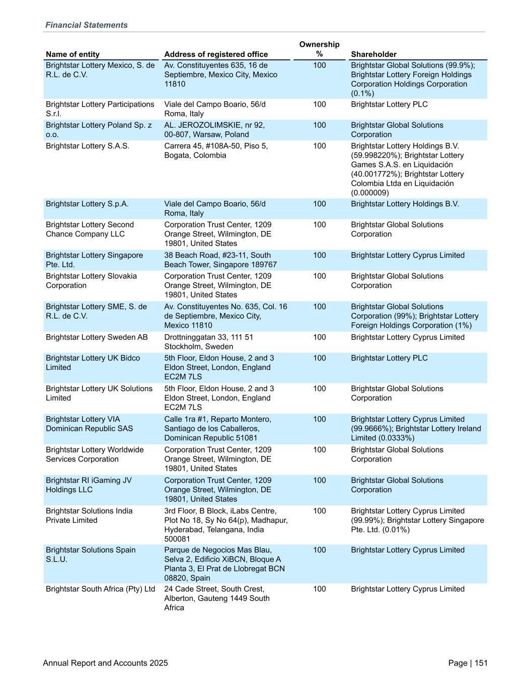 Brightstar Lottery Mexico, S. de R.L. de C.V. Av. Constituyentes 635, 16 de Septiembre, Mexico City, Mexico 11810 100 Brightstar Global Solutions (99.9%); Brightstar Lottery Foreign Holdings Corporation Holdings Corporation (0.1%) Brightstar Lottery Participations S.r.l. Viale del Campo Boario, 56/d Roma, Italy 100 Brightstar Lottery PLC Brightstar Lottery Poland Sp. z o.o. AL. JEROZOLIMSKIE, nr 92, 00-807, Warsaw, Poland 100 Brightstar Global Solutions Corporation Brightstar Lottery S.A.S. Carrera 45, #108A-50, Piso 5, Bogata, Colombia 100 Brightstar Lottery Holdings B.V. (59.998220%); Brightstar Lottery Games S.A.S. en Liquidación (40.001772%); Brightstar Lottery Colombia Ltda en Liquidación (0.000009) Brightstar Lottery S.p.A. Viale del Campo Boario, 56/d Roma, Italy 100 Brightstar Lottery Holdings B.V. Brightstar Lottery Second Chance Company LLC Corporation Trust Center, 1209 Orange Street, Wilmington, DE 19801, United States 100 Brightstar Global Solutions Corporation Brightstar Lottery Singapore Pte. Ltd. 38 Beach Road, #23-11, South Beach Tower, Singapore 189767 100 Brightstar Lottery Cyprus Limited Brightstar Lottery Slovakia Corporation Corporation Trust Center, 1209 Orange Street, Wilmington, DE 19801, United States 100 Brightstar Global Solutions Corporation Brightstar Lottery SME, S. de R.L. de C.V. Av. Constituyentes No. 635, Col. 16 de Septiembre, Mexico City, Mexico 11810 100 Brightstar Global Solutions Corporation (99%); Brightstar Lottery Foreign Holdings Corporation (1%) Brightstar Lottery Sweden AB Drottninggatan 33, 111 51 Stockholm, Sweden 100 Brightstar Lottery Cyprus Limited Brightstar Lottery UK Bidco Limited 5th Floor, Eldon House, 2 and 3 Eldon Street, London, England EC2M 7LS 100 Brightstar Lottery PLC Brightstar Lottery UK Solutions Limited 5th Floor, Eldon House, 2 and 3 Eldon Street, London, England EC2M 7LS 100 Brightstar Global Solutions Corporation Brightstar Lottery VIA Dominican Republic SAS Calle 1ra #1, Reparto Montero, Santiago de los Caballeros, Dominican Republic 51081 100 Brightstar Lottery Cyprus Limited (99.9666%); Brightstar Lottery Ireland Limited (0.0333%) Brightstar Lottery Worldwide Services Corporation Corporation Trust Center, 1209 Orange Street, Wilmington, DE 19801, United States 100 Brightstar Global Solutions Corporation Brightstar RI iGaming JV Holdings LLC Corporation Trust Center, 1209 Orange Street, Wilmington, DE 19801, United States 100 Brightstar Global Solutions Corporation Brightstar Solutions India Private Limited 3rd Floor, B Block, iLabs Centre, Plot No 18, Sy No 64(p), Madhapur, Hyderabad, Telangana, India 500081 100 Brightstar Lottery Cyprus Limited (99.99%); Brightstar Lottery Singapore Pte. Ltd. (0.01%) Brightstar Solutions Spain S.L.U. Parque de Negocios Mas Blau, Selva 2, Edificio XiBCN, Bloque A Planta 3, El Prat de Llobregat BCN 08820, Spain 100 Brightstar Lottery Cyprus Limited Brightstar South Africa (Pty) Ltd 24 Cade Street, South Crest, Alberton, Gauteng 1449 South Africa 100 Brightstar Lottery Cyprus Limited Name of entity Address of registered office Ownership % Shareholder Financial Statements Annual Report and Accounts 2025 Page | 151