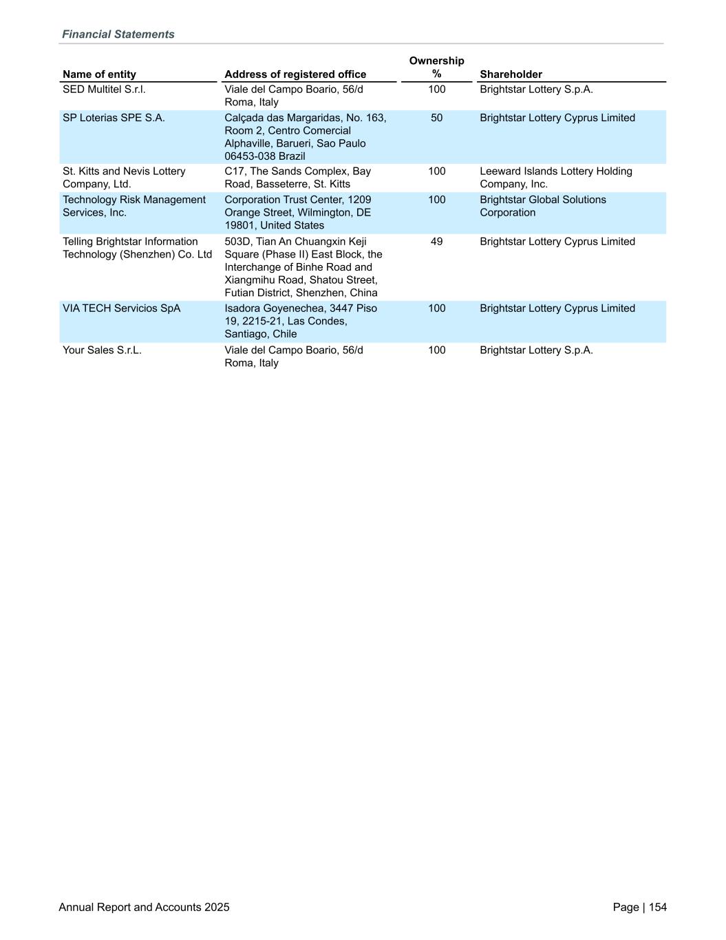 SED Multitel S.r.l. Viale del Campo Boario, 56/d Roma, Italy 100 Brightstar Lottery S.p.A. SP Loterias SPE S.A. Calçada das Margaridas, No. 163, Room 2, Centro Comercial Alphaville, Barueri, Sao Paulo 06453-038 Brazil 50 Brightstar Lottery Cyprus Limited St. Kitts and Nevis Lottery Company, Ltd. C17, The Sands Complex, Bay Road, Basseterre, St. Kitts 100 Leeward Islands Lottery Holding Company, Inc. Technology Risk Management Services, Inc. Corporation Trust Center, 1209 Orange Street, Wilmington, DE 19801, United States 100 Brightstar Global Solutions Corporation Telling Brightstar Information Technology (Shenzhen) Co. Ltd 503D, Tian An Chuangxin Keji Square (Phase II) East Block, the Interchange of Binhe Road and Xiangmihu Road, Shatou Street, Futian District, Shenzhen, China 49 Brightstar Lottery Cyprus Limited VIA TECH Servicios SpA Isadora Goyenechea, 3447 Piso 19, 2215-21, Las Condes, Santiago, Chile 100 Brightstar Lottery Cyprus Limited Your Sales S.r.L. Viale del Campo Boario, 56/d Roma, Italy 100 Brightstar Lottery S.p.A. Name of entity Address of registered office Ownership % Shareholder Financial Statements Annual Report and Accounts 2025 Page | 154