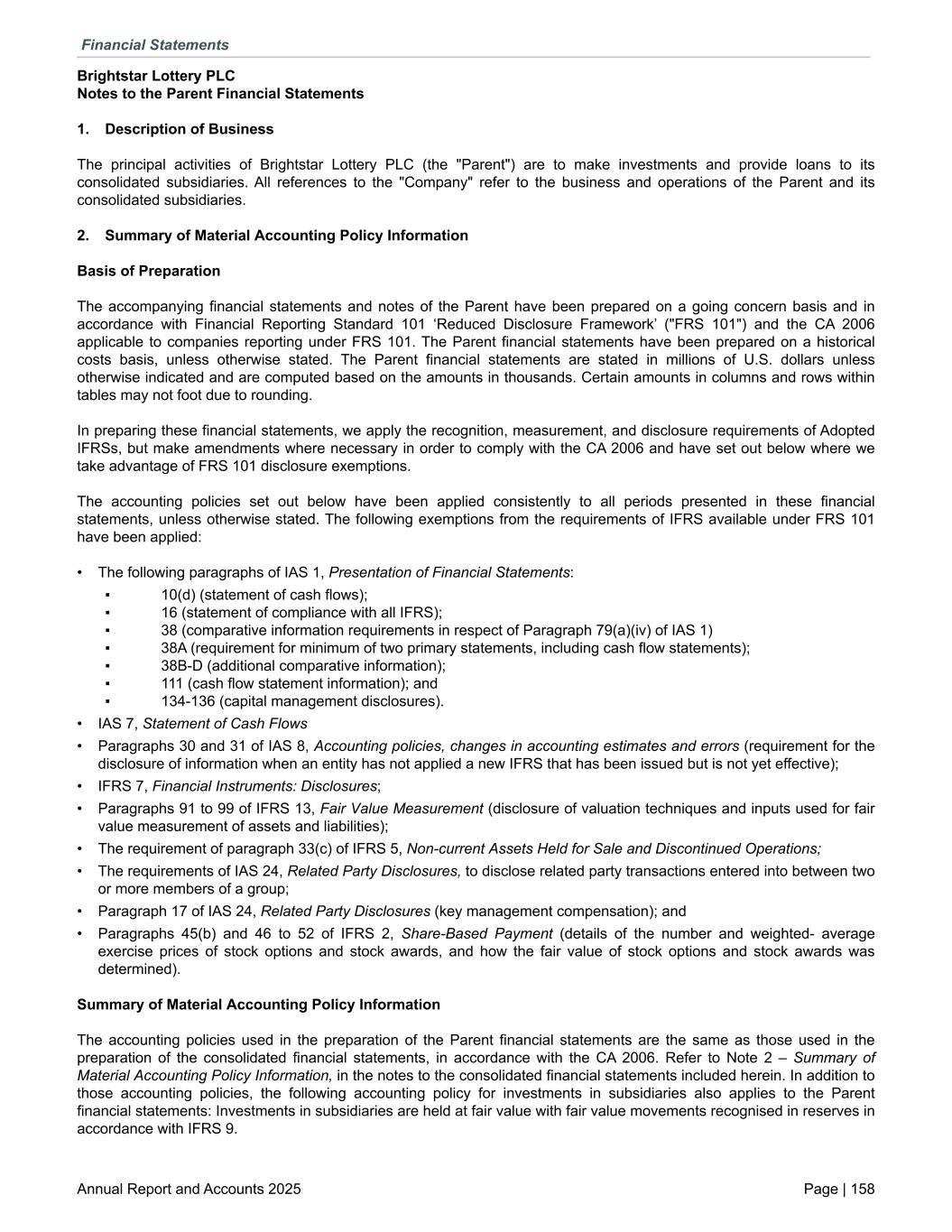 Brightstar Lottery PLC Notes to the Parent Financial Statements 1. Description of Business The principal activities of Brightstar Lottery PLC (the "Parent") are to make investments and provide loans to its consolidated subsidiaries. All references to the "Company" refer to the business and operations of the Parent and its consolidated subsidiaries. 2. Summary of Material Accounting Policy Information Basis of Preparation The accompanying financial statements and notes of the Parent have been prepared on a going concern basis and in accordance with Financial Reporting Standard 101 ‘Reduced Disclosure Framework’ ("FRS 101") and the CA 2006 applicable to companies reporting under FRS 101. The Parent financial statements have been prepared on a historical costs basis, unless otherwise stated. The Parent financial statements are stated in millions of U.S. dollars unless otherwise indicated and are computed based on the amounts in thousands. Certain amounts in columns and rows within tables may not foot due to rounding. In preparing these financial statements, we apply the recognition, measurement, and disclosure requirements of Adopted IFRSs, but make amendments where necessary in order to comply with the CA 2006 and have set out below where we take advantage of FRS 101 disclosure exemptions. The accounting policies set out below have been applied consistently to all periods presented in these financial statements, unless otherwise stated. The following exemptions from the requirements of IFRS available under FRS 101 have been applied: • The following paragraphs of IAS 1, Presentation of Financial Statements: ▪ 10(d) (statement of cash flows); ▪ 16 (statement of compliance with all IFRS); ▪ 38 (comparative information requirements in respect of Paragraph 79(a)(iv) of IAS 1) ▪ 38A (requirement for minimum of two primary statements, including cash flow statements); ▪ 38B-D (additional comparative information); ▪ 111 (cash flow statement information); and ▪ 134-136 (capital management disclosures). • IAS 7, Statement of Cash Flows • Paragraphs 30 and 31 of IAS 8, Accounting policies, changes in accounting estimates and errors (requirement for the disclosure of information when an entity has not applied a new IFRS that has been issued but is not yet effective); • IFRS 7, Financial Instruments: Disclosures; • Paragraphs 91 to 99 of IFRS 13, Fair Value Measurement (disclosure of valuation techniques and inputs used for fair value measurement of assets and liabilities); • The requirement of paragraph 33(c) of IFRS 5, Non-current Assets Held for Sale and Discontinued Operations; • The requirements of IAS 24, Related Party Disclosures, to disclose related party transactions entered into between two or more members of a group; • Paragraph 17 of IAS 24, Related Party Disclosures (key management compensation); and • Paragraphs 45(b) and 46 to 52 of IFRS 2, Share-Based Payment (details of the number and weighted- average exercise prices of stock options and stock awards, and how the fair value of stock options and stock awards was determined). Summary of Material Accounting Policy Information The accounting policies used in the preparation of the Parent financial statements are the same as those used in the preparation of the consolidated financial statements, in accordance with the CA 2006. Refer to Note 2 – Summary of Material Accounting Policy Information, in the notes to the consolidated financial statements included herein. In addition to those accounting policies, the following accounting policy for investments in subsidiaries also applies to the Parent financial statements: Investments in subsidiaries are held at fair value with fair value movements recognised in reserves in accordance with IFRS 9. Financial Statements Annual Report and Accounts 2025 Page | 158
