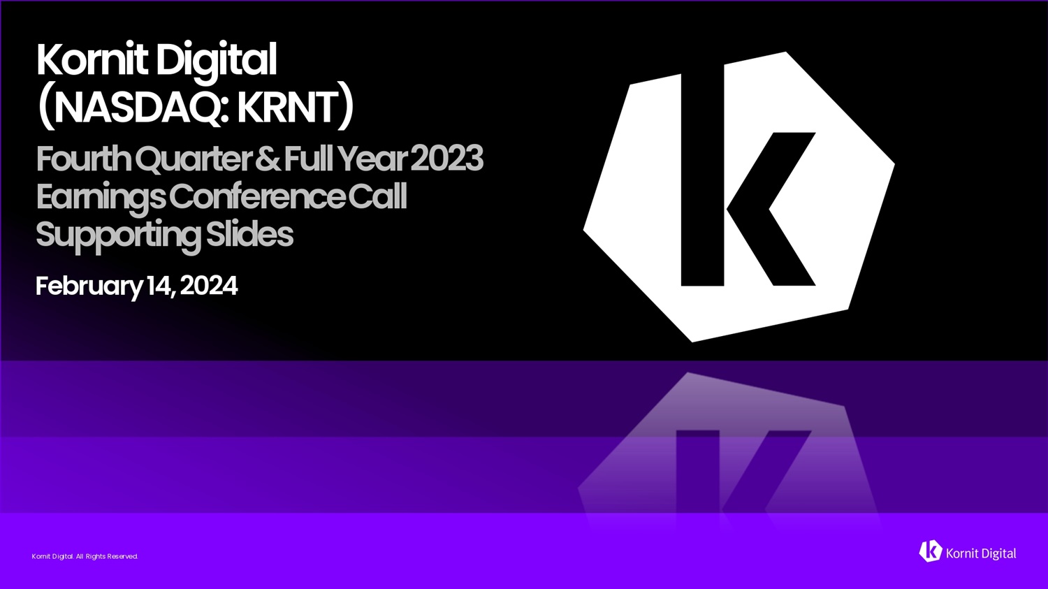 Korfiit Digital (NASDAQ: KRNT) F o u r t h Q u a r t e r & F u l l Y e a r 2 0 2 3 E a rfi i fi g s C o fi f e r e fi c e C a l l S u pp o r t i fi g S li d e s February 14, 2024 Kornit Digital. All Rights Reserved.
