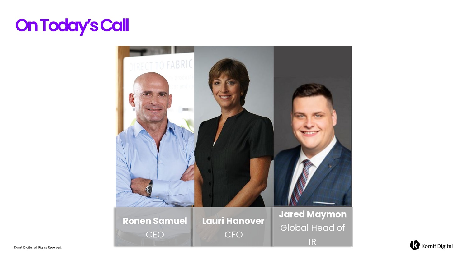 O f i T o d 6 y ’ s C6 l l Ronen Samuel CEO Lauri Hanover CFO Jared Maymon Global Head of IR Kornit Digital. All Rights Reserved.