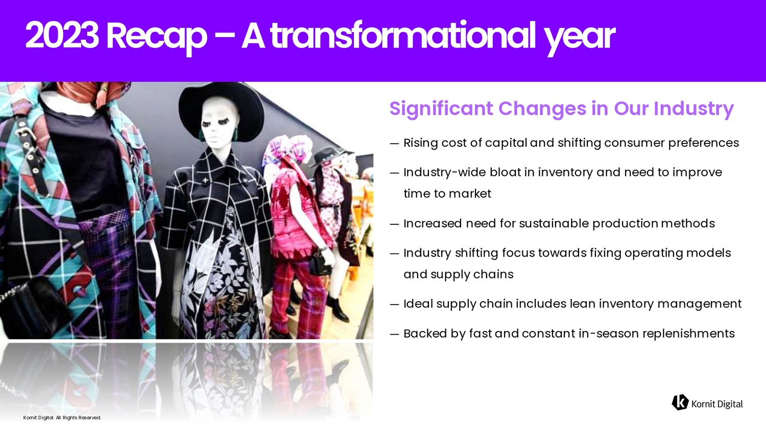 Kornit Digital. All Rights Reserved. 2023 R e c 6 p – A tr6fisform6tiofi6l ye6r Kornit Digital. All Rights Reserved. Sigfiific6fit Ch6figes ifi Our Ifidustry — Rising cost of capital and shifting consumer preferences — Industry - wide bloat in inventory and need to improve time to market — Increased need for sustainable production methods — Industry shifting focus towards fixing operating models and supply chains — Ideal supply chain includes lean inventory management — Backed by fast and constant in - season replenishments