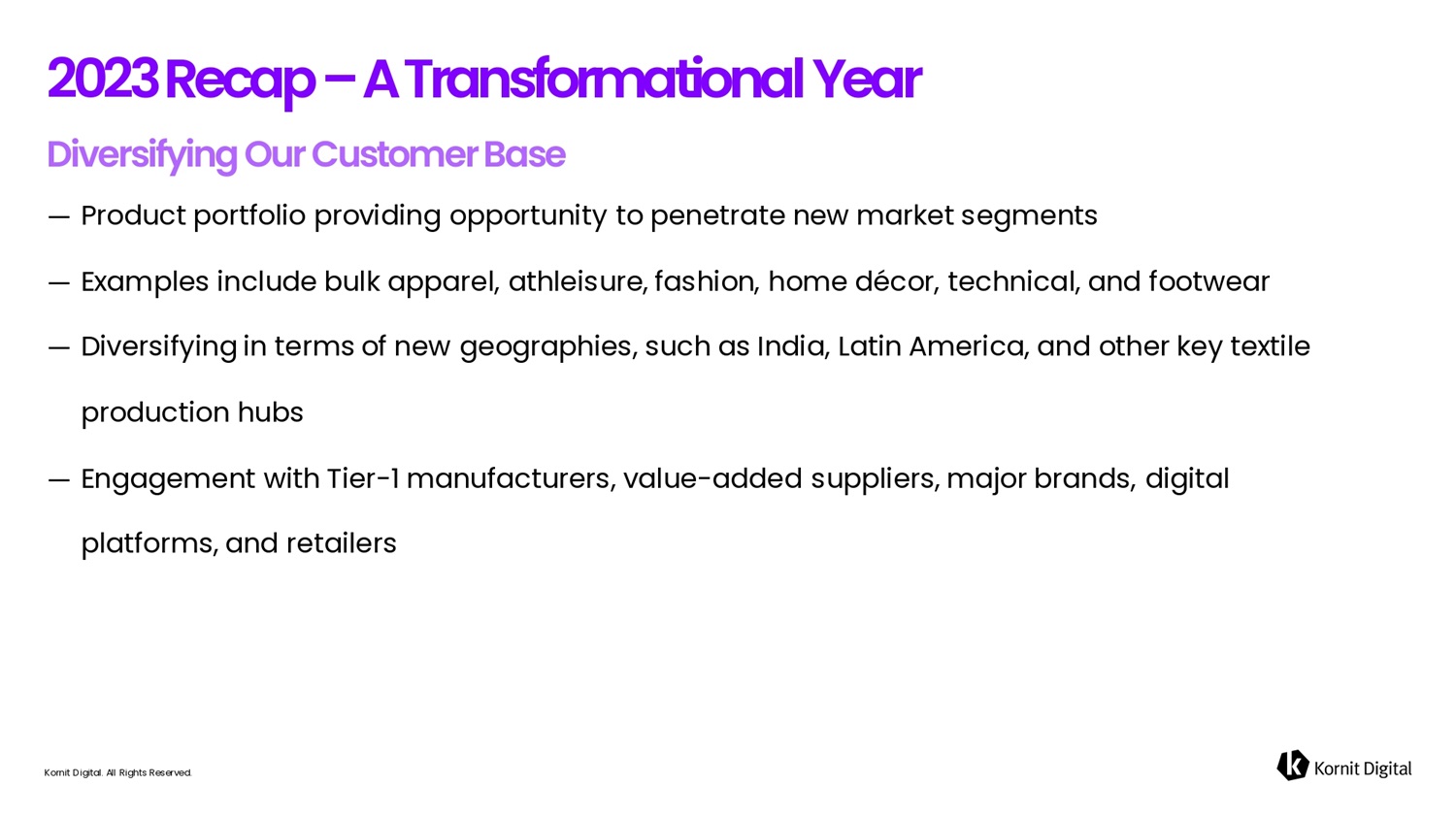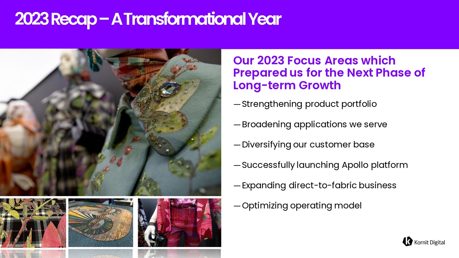K K o o r r n n it it D D i i g g i i t t a a l. A A l ll R R i i g g h h t t s s R R e e s s e e r r v v e e d d . 2 0 2 3 R e c 6 p – A T r 6 fi s f o r m 6 t i o fi 6 l Ye6r Our 2023 Focus Are6s which Prep6red us for the Next Ph6se of Lofig - term Growth ― Strengthening product portfolio ― Broadening applications we serve ― Diversifying our customer base ― Successfully launching Apollo platform ― Expanding direct - to - fabric business ― Optimizing operating model