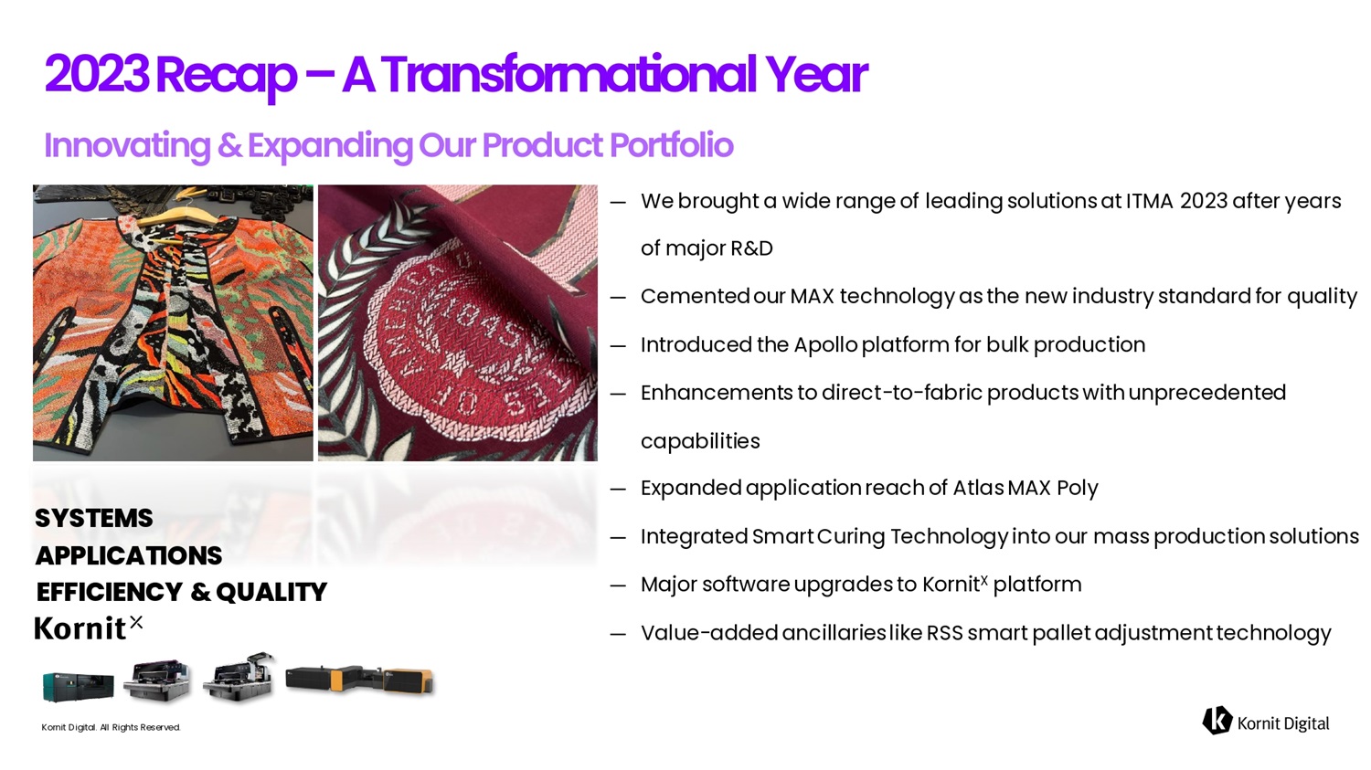 — We brought a wide range of leading solutions at ITMA 2023 after years of major R&D — Cemented our MAX technology as the new industry standard for quality — Introduced the Apollo platform for bulk production — Enhancements to direct - to - fabric products with unprecedented capabilities — Expanded application reach of Atlas MAX Poly — Integrated Smart Curing Technology into our mass production solutions — Major software upgrades to Kornit X platform — Value - added ancillaries like RSS smart pallet adjustment technology 2 0 2 3 R e c 6 p – A T r 6 fi s f o r m 6 t i o fi 6 l Ye6r SYSTEMS APPLICATIONS Kornit Digital. All Rights Reserved. EFFICIENCY & QUALITY