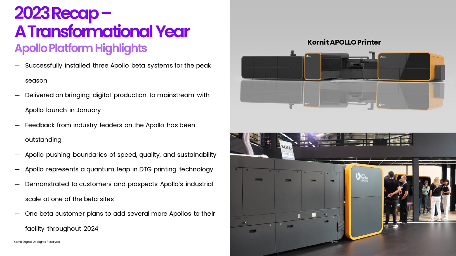 — Successfully installed three Apollo beta systems for the peak season — Delivered on bringing digital production to mainstream with Apollo launch in January — Feedback from industry leaders on the Apollo has been outstanding — Apollo pushing boundaries of speed, quality, and sustainability — Apollo represents a quantum leap in DTG printing technology — Demonstrated to customers and prospects Apollo’s industrial scale at one of the beta sites — One beta customer plans to add several more Apollos to their facility throughout 2024 2 0 2 3 R e c 6 p – A T r 6 fi s f o r m 6 t i o fi 6 l Ye6r Kornit APOLLO Printer Kornit Digital. All Rights Reserved.