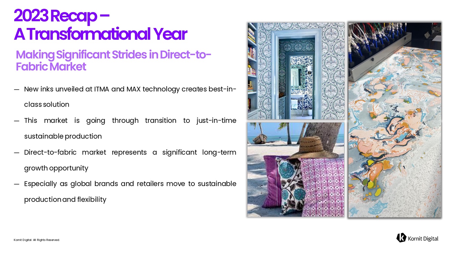 — New inks unveiled at ITMA and MAX technology creates best - in - class solution — This market is going sustainable production — Direct - to - fabric market growth opportunity through transition to just - in - time represents a significant long - term — Especially as global brands and retailers move to sustainable production and flexibility 2 0 2 3 R e c 6 p – A T r 6 fi s f o r m 6 t i o fi 6 l Ye6r Kornit Digital. All Rights Reserved.
