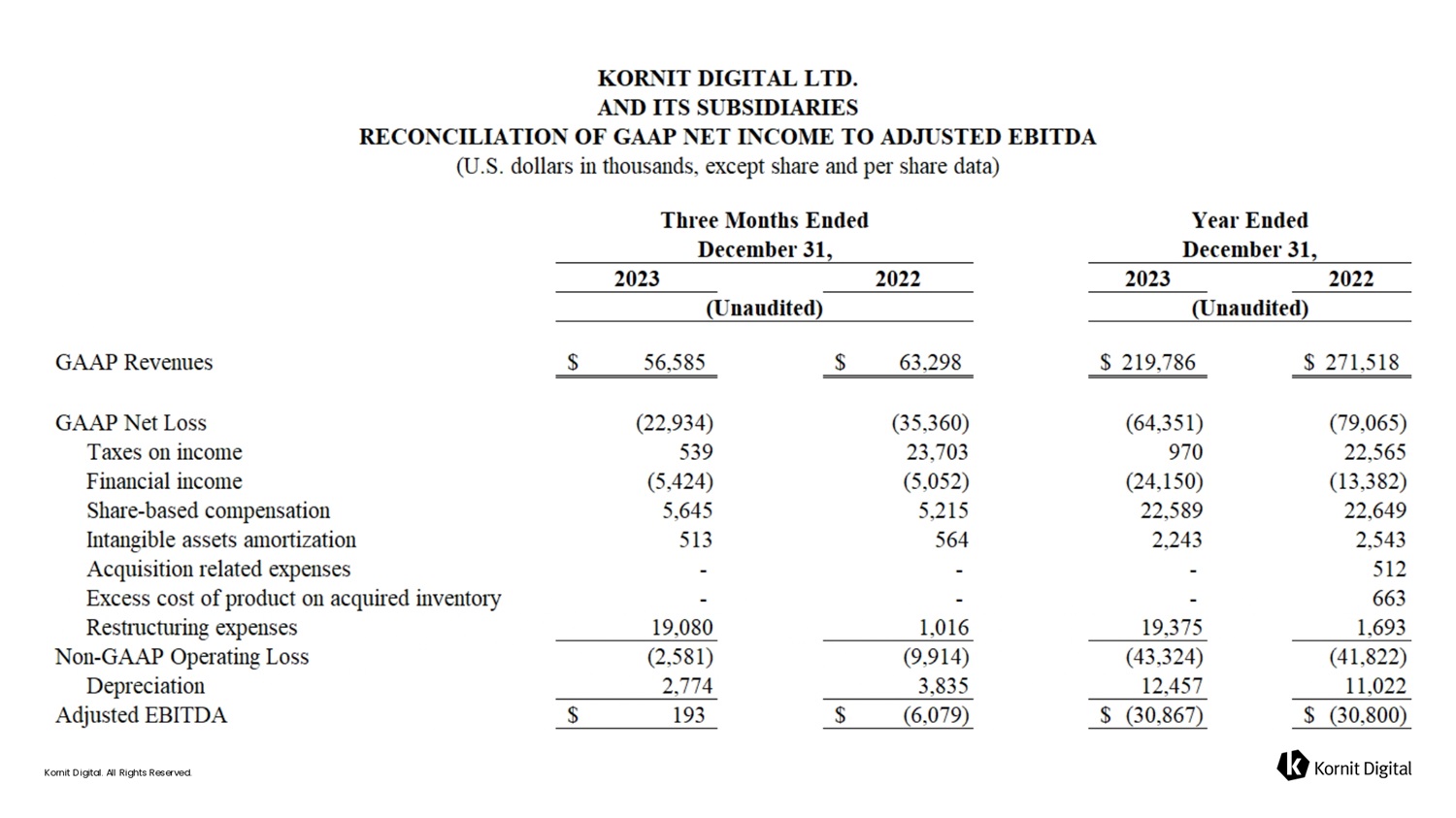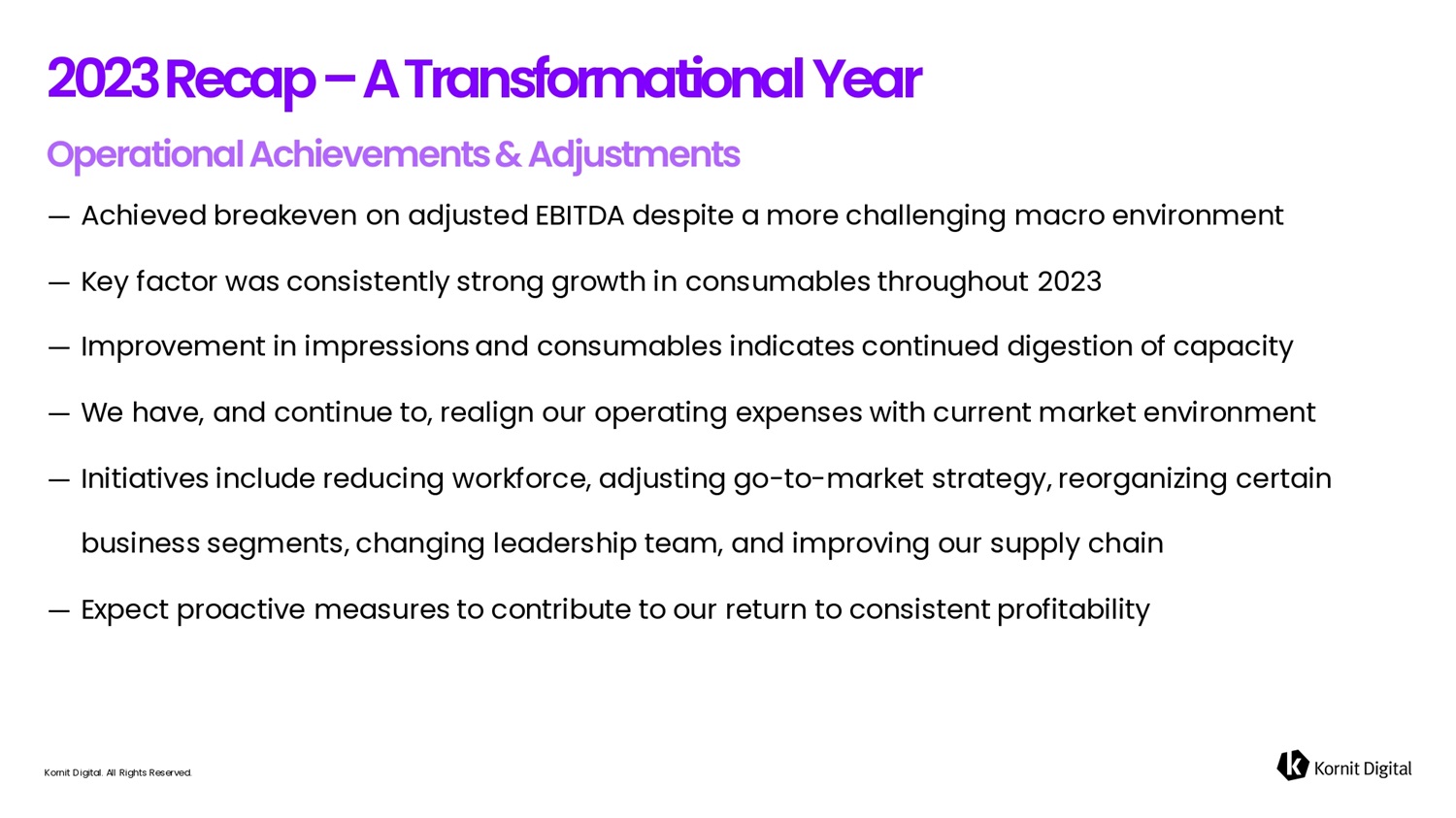 — Achieved breakeven on adjusted EBITDA despite a more challenging macro environment — Key factor was consistently strong growth in consumables throughout 2023 — Improvement in impressions and consumables indicates continued digestion of capacity — We have, and continue to, realign our operating expenses with current market environment — Initiatives include reducing workforce, adjusting go - to - market strategy, reorganizing certain business segments, changing leadership team, and improving our supply chain — Expect proactive measures to contribute to our return to consistent profitability 2 0 2 3 R e c 6 p – A T r 6 fi s f o r m 6 t i o fi 6 l Ye6r Kornit Digital. All Rights Reserved.