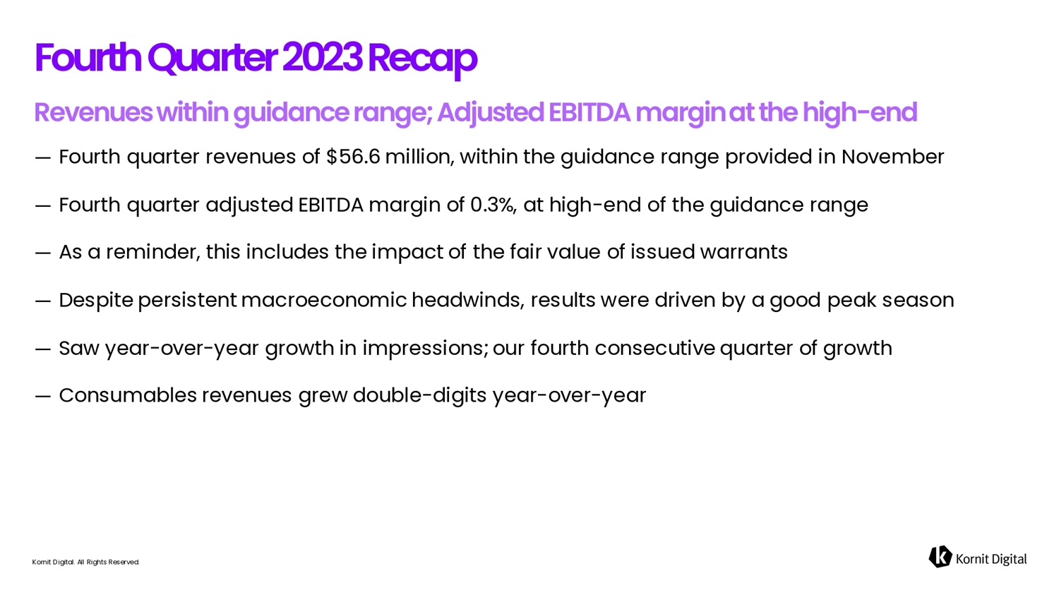 — Fourth quarter revenues of $56.6 million, within the guidance range provided in November — Fourth quarter adjusted EBITDA margin of 0.3%, at high - end of the guidance range — As a reminder, this includes the impact of the fair value of issued warrants — Despite persistent macroeconomic headwinds, results were driven by a good peak season — Saw year - over - year growth in impressions; our fourth consecutive quarter of growth — Consumables revenues grew double - digits year - over - year F o u r t h Q u 6 r t e r 2 0 2 3 R e c 6 p Kornit Digital. All Rights Reserved.