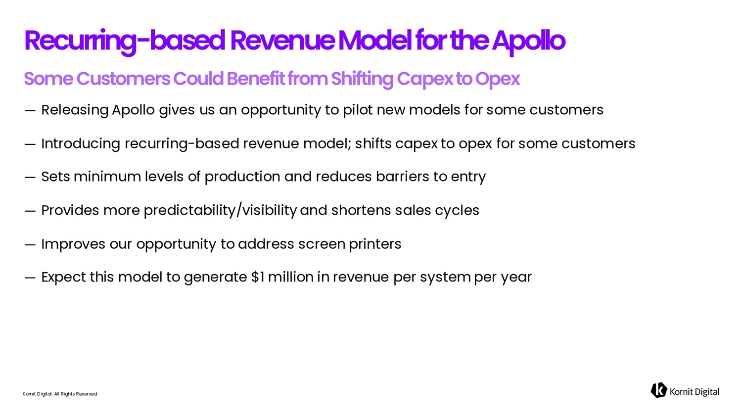— Releasing Apollo gives us an opportunity to pilot new models for some customers — Introducing recurring - based revenue model; shifts capex to opex for some customers — Sets minimum levels of production and reduces barriers to entry — Provides more predictability/visibility and shortens sales cycles — Improves our opportunity to address screen printers — Expect this model to generate $1 million in revenue per system per year Recurrifig - b6sed R e v e fi u e M o d e l f o r t h e A p o ll o Kornit Digital. All Rights Reserved.