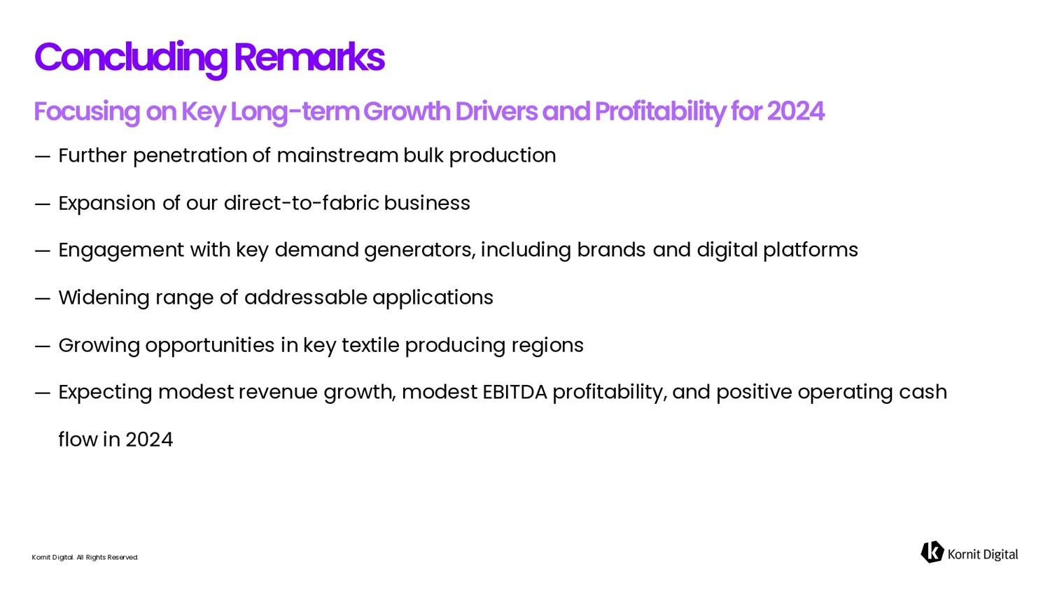 — Further penetration of mainstream bulk production — Expansion of our direct - to - fabric business — Engagement with key demand generators, including brands and digital platforms — Widening range of addressable applications — Growing opportunities in key textile producing regions — Expecting modest revenue growth, modest EBITDA profitability, and positive operating cash flow in 2024 Coficludifig Rem6rks Kornit Digital. All Rights Reserved.