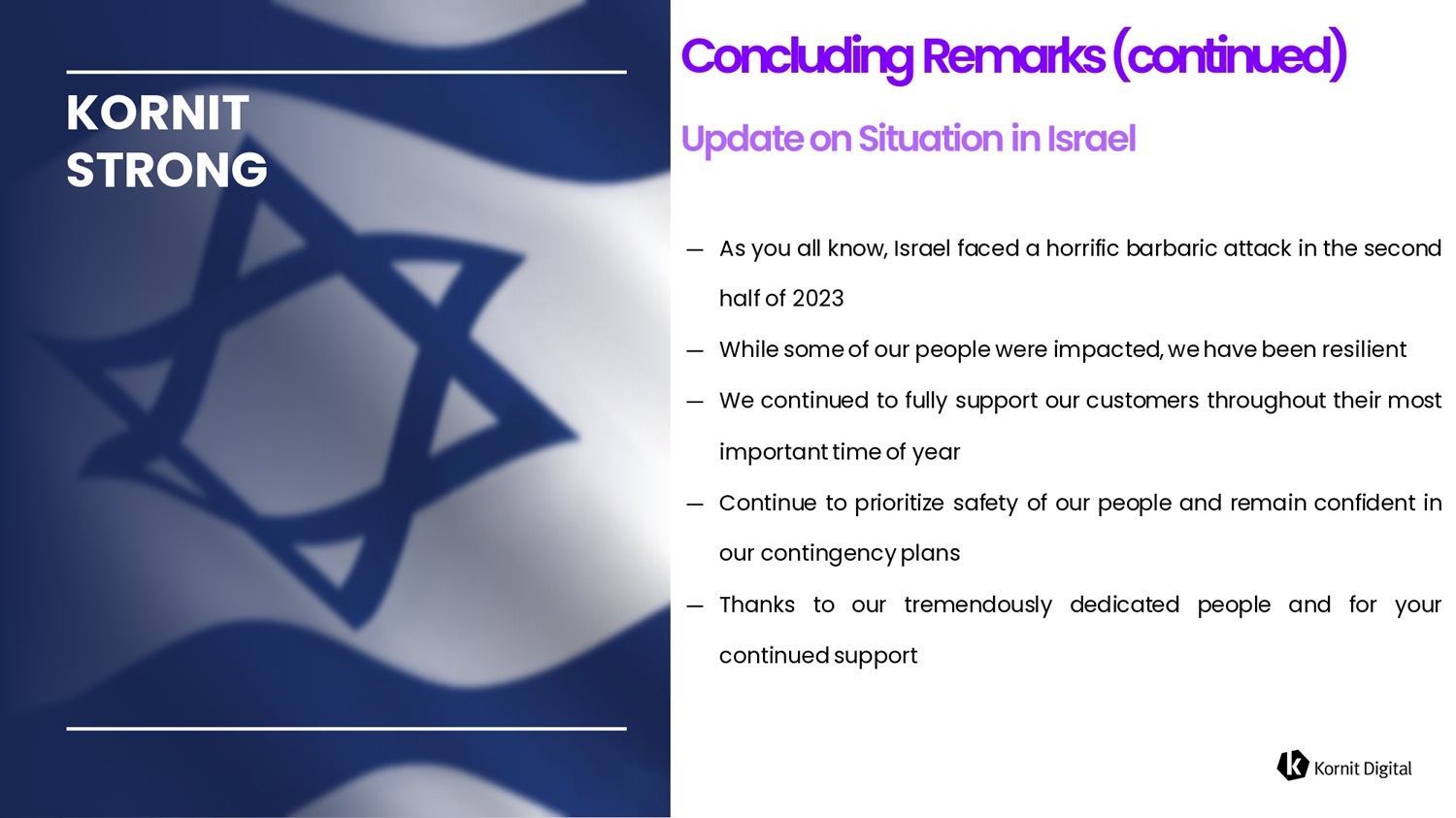 Kornit Digital. All Rights Reserved. — As you all know, Israel faced a horrific barbaric attack in the second half of 2023 — While some of our people were impacted, we have been resilient — We continued to fully support our customers throughout their most important time of year — Continue to prioritize safety of our people and remain confident in our contingency plans — Thanks to our tremendously dedicated people and for your continued support Coficludifig Rem6rks(cofitifiued) KORNIT STRONG