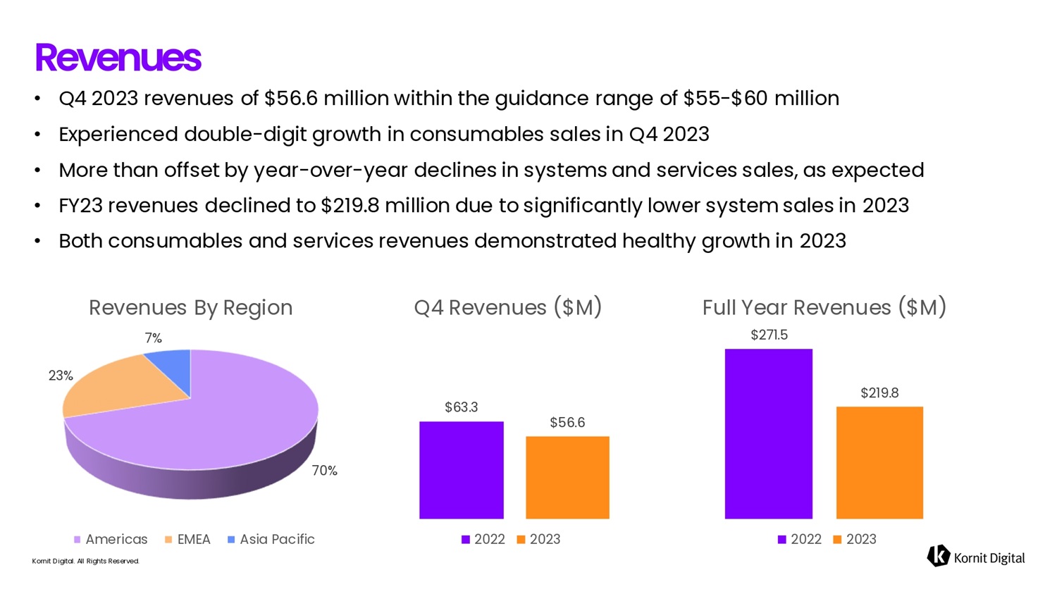 • Q4 2023 revenues of $56.6 million within the guidance range of $55 - $60 million • Experienced double - digit growth in consumables sales in Q4 2023 • More than offset by year - over - year declines in systems and services sales, as expected • FY23 revenues declined to $219.8 million due to significantly lower system sales in 2023 • Both consumables and services revenues demonstrated healthy growth in 2023 Revefiues $63.3 $56.6 Q4 Revenues ($M) 2022 2023 Full Year Revenues ($M) $271.5 $219.8 2022 2023 70% 23% Revenues By Region 7% Americas EMEA Asia Pacific Kornit Digital. All Rights Reserved.