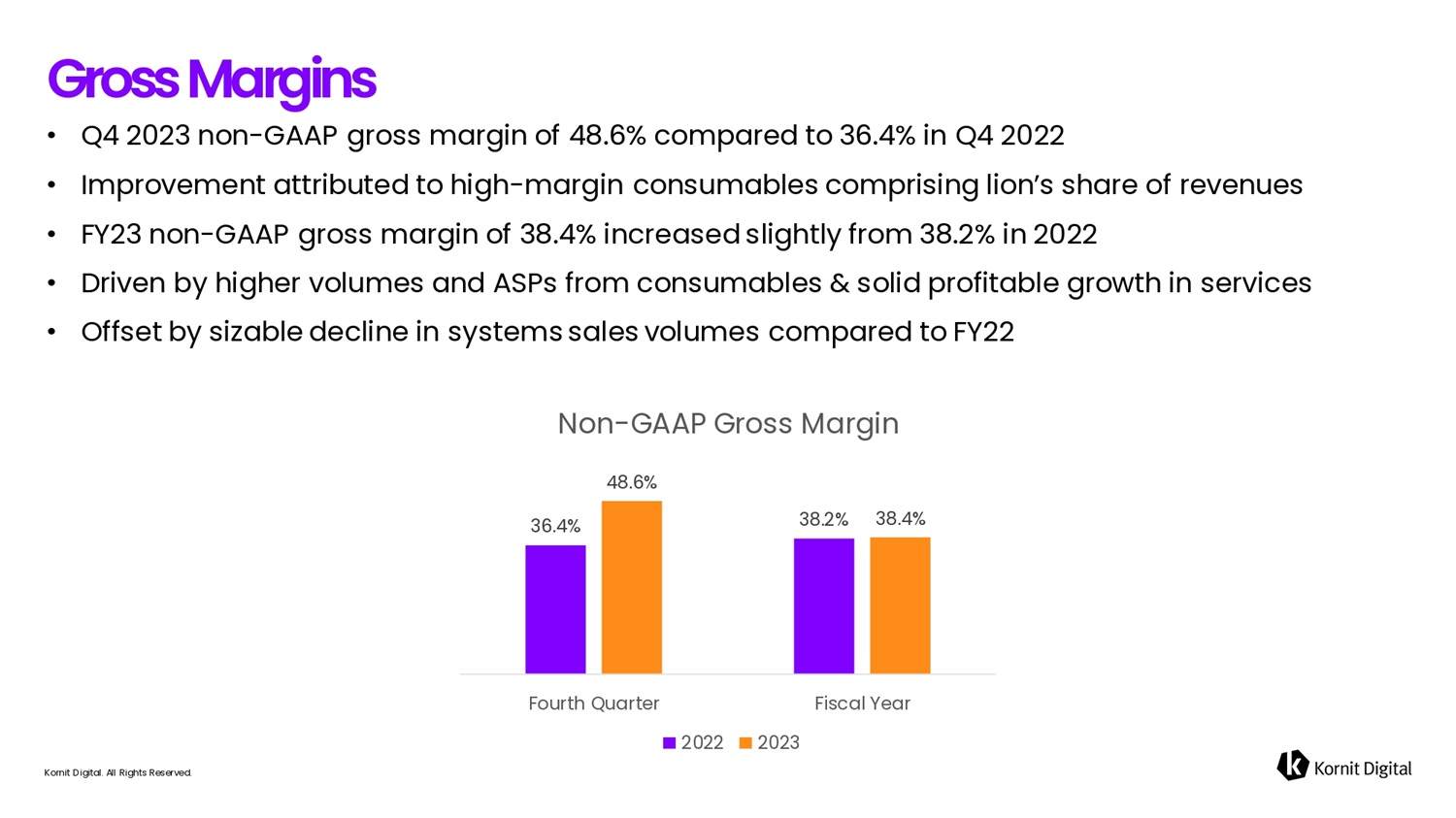 Gross M6rgifis • Q4 2023 non - GAAP gross margin of 48.6% compared to 36.4% in Q4 2022 • Improvement attributed to high - margin consumables comprising lion’s share of revenues • FY23 non - GAAP gross margin of 38.4% increased slightly from 38.2% in 2022 • Driven by higher volumes and ASPs from consumables & solid profitable growth in services • Offset by sizable decline in systems sales volumes compared to FY22 Non - GAAP Gross Margin 48.6% 36.4% 38.2% 38.4% Fourth Quarter Fiscal Year 2022 2023 Kornit Digital. All Rights Reserved.