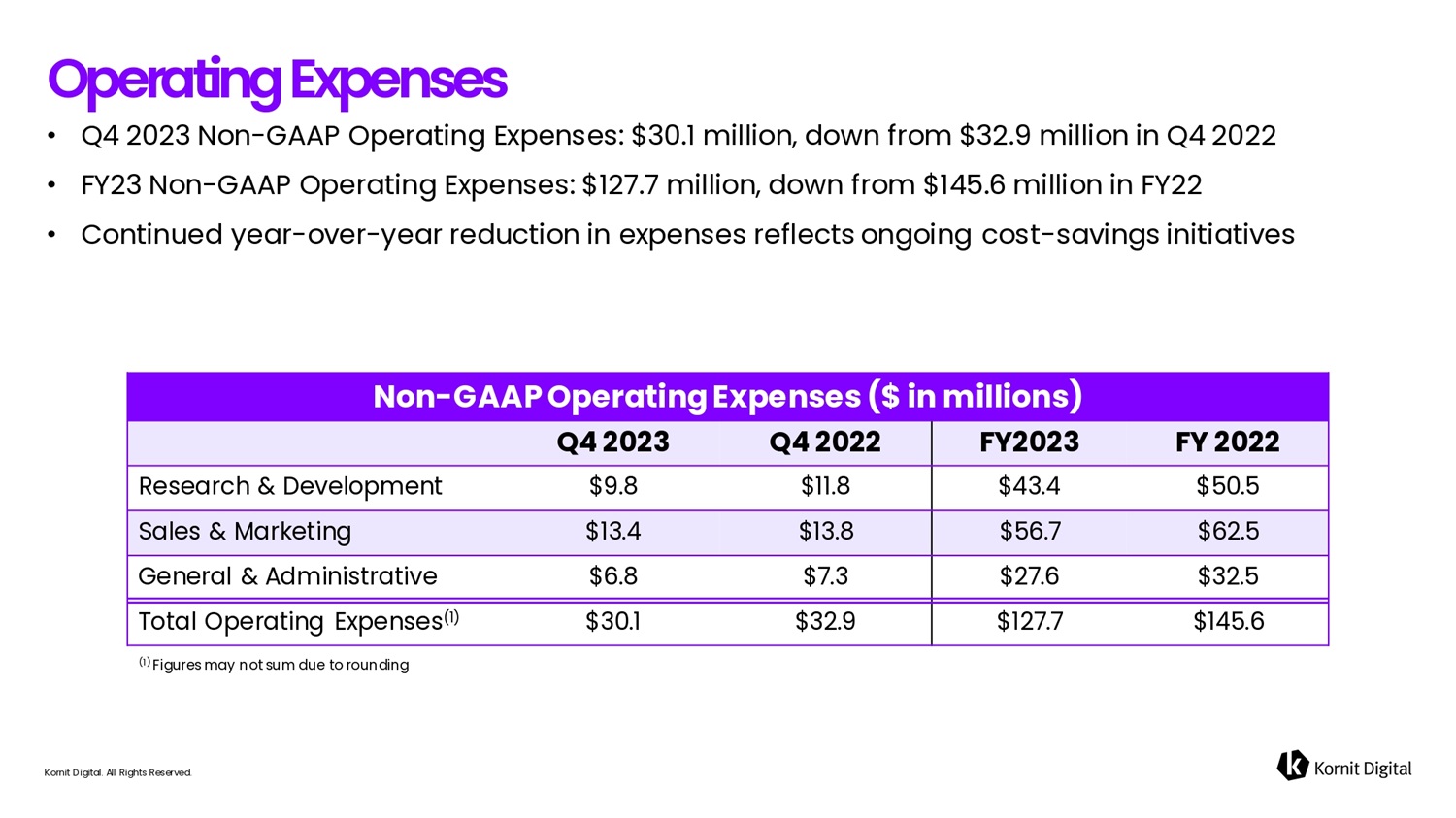 • Q4 2023 Non - GAAP Operating Expenses: $30.1 million, down from $32.9 million in Q4 2022 • FY23 Non - GAAP Operating Expenses: $127.7 million, down from $145.6 million in FY22 • Continued year - over - year reduction in expenses reflects ongoing cost - savings initiatives Kornit Digital. All Rights Reserved. Oper6tifig Expefises Non - GAAP Operating Expenses ($ in millions) FY 2022 FY2023 Q4 2022 Q4 2023 $50.5 $43.4 $11.8 $9.8 Research & Development $62.5 $56.7 $13.8 $13.4 Sales & Marketing $32.5 $27.6 $7.3 $6.8 General & Administrative $145.6 $127.7 $32.9 $30.1 Total Operating Expenses (1) (1) Figures may not sum due to rounding