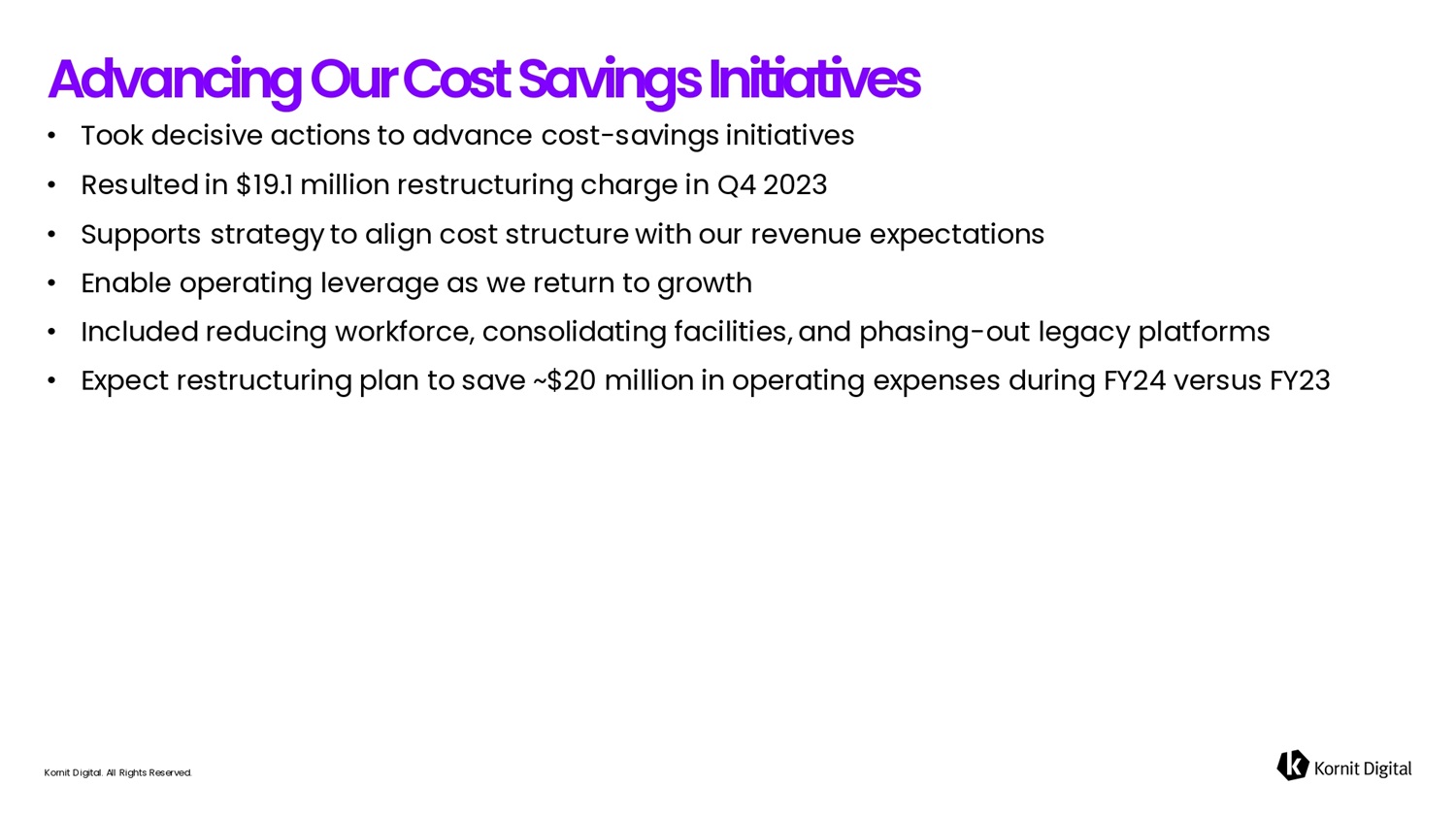 • Took decisive actions to advance cost - savings initiatives • Resulted in $19.1 million restructuring charge in Q4 2023 • Supports strategy to align cost structure with our revenue expectations • Enable operating leverage as we return to growth • Included reducing workforce, consolidating facilities, and phasing - out legacy platforms • Expect restructuring plan to save ~$20 million in operating expenses during FY24 versus FY23 Kornit Digital. All Rights Reserved. Adv6ficifig O u r C o s t S 6 v i fi g s I fi i t i 6 t i v e s