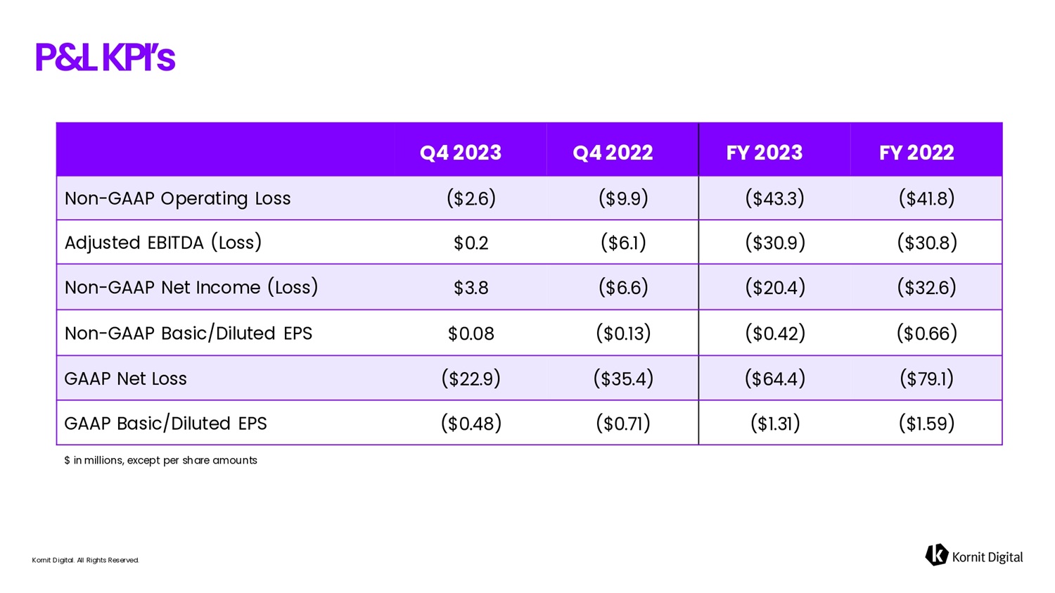 P & L K P I ’ s Kornit Digital. All Rights Reserved. FY 2022 FY 2023 Q4 2022 Q4 2023 ($41.8) ($43.3) ($9.9) ($2.6) Non - GAAP Operating Loss ($30.8) ($30.9) ($6.1) $0.2 Adjusted EBITDA (Loss) ($32.6) ($20.4) ($6.6) $3.8 Non - GAAP Net Income (Loss) ($0.66) ($0.42) ($0.13) $0.08 Non - GAAP Basic/Diluted EPS ($79.1) ($64.4) ($35.4) ($22.9) GAAP Net Loss ($1.59) ($1.31) ($0.71) ($0.48) GAAP Basic/Diluted EPS $ in millions, except per share amounts