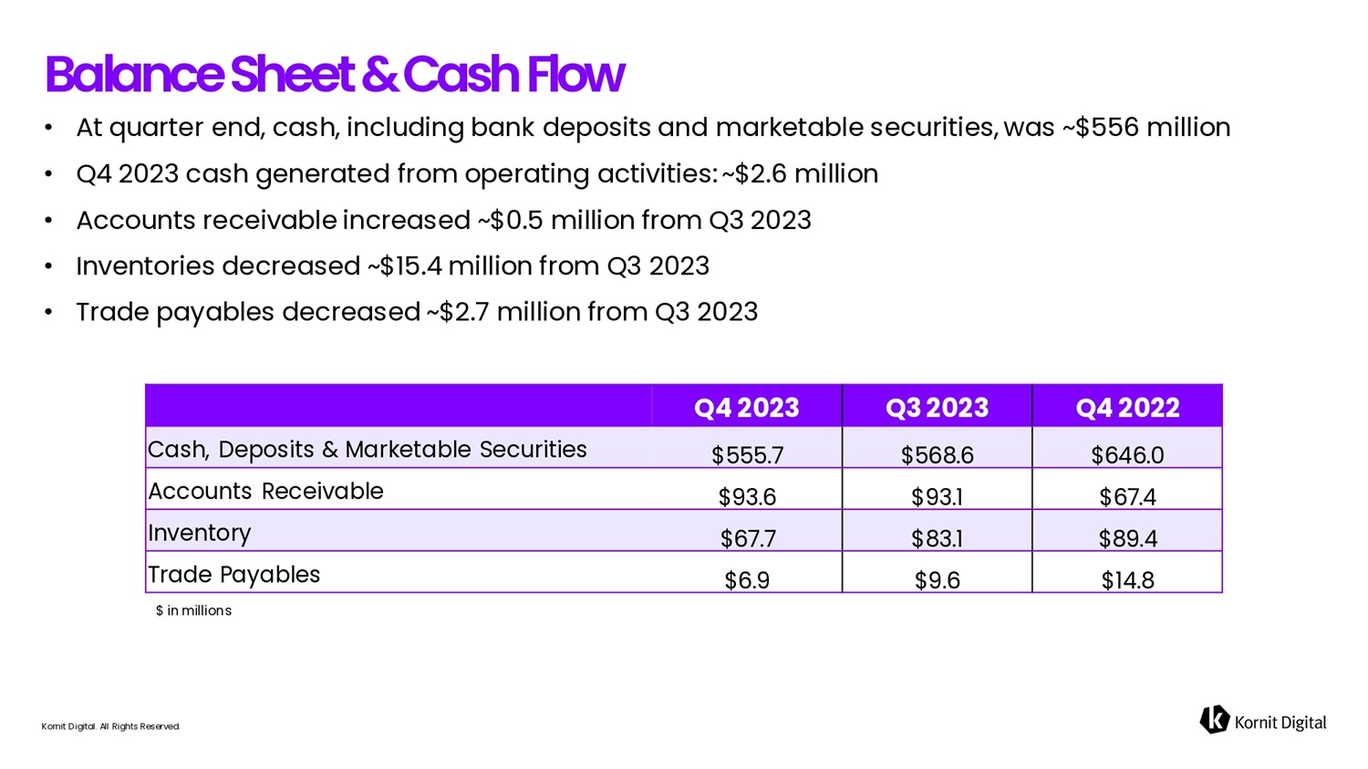 • At quarter end, cash, including bank deposits and marketable securities, was ~$556 million • Q4 2023 cash generated from operating activities: ~$2.6 million • Accounts receivable increased ~$0.5 million from Q3 2023 • Inventories decreased ~$15.4 million from Q3 2023 • Trade payables decreased ~$2.7 million from Q3 2023 Kornit Digital. All Rights Reserved. B 6 l 6 fi c e S h ee t & C 6 s h F l o w Q4 2022 Q3 2023 Q4 2023 $646.0 $568.6 $555.7 Cash, Deposits & Marketable Securities $67.4 $93.1 $93.6 Accounts Receivable $89.4 $83.1 $67.7 Inventory $14.8 $9.6 $6.9 Trade Payables $ in millions