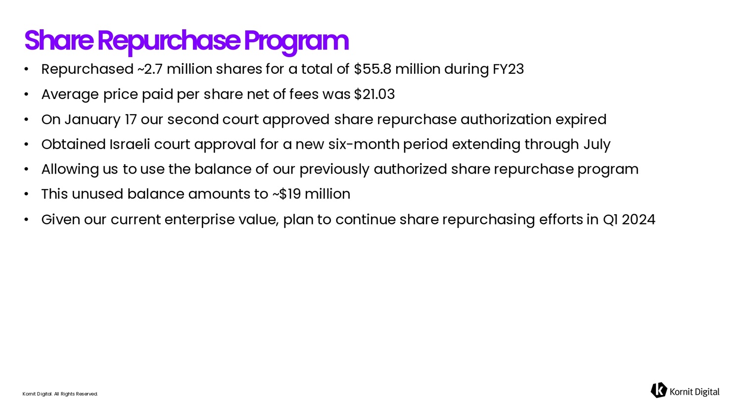 • Repurchased ~2.7 million shares for a total of $55.8 million during FY23 • Average price paid per share net of fees was $21.03 • On January 17 our second court approved share repurchase authorization expired • Obtained Israeli court approval for a new six - month period extending through July • Allowing us to use the balance of our previously authorized share repurchase program • This unused balance amounts to ~$19 million • Given our current enterprise value, plan to continue share repurchasing efforts in Q1 2024 Kornit Digital. All Rights Reserved. Sh6re Repurch6se Progr6m