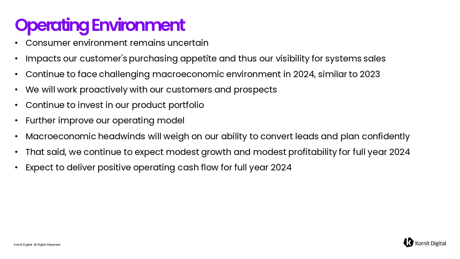 • Consumer environment remains uncertain • Impacts our customer's purchasing appetite and thus our visibility for systems sales • Continue to face challenging macroeconomic environment in 2024, similar to 2023 • We will work proactively with our customers and prospects • Continue to invest in our product portfolio • Further improve our operating model • Macroeconomic headwinds will weigh on our ability to convert leads and plan confidently • That said, we continue to expect modest growth and modest profitability for full year 2024 • Expect to deliver positive operating cash flow for full year 2024 Kornit Digital. All Rights Reserved. Oper6tifig Efivirofimefit