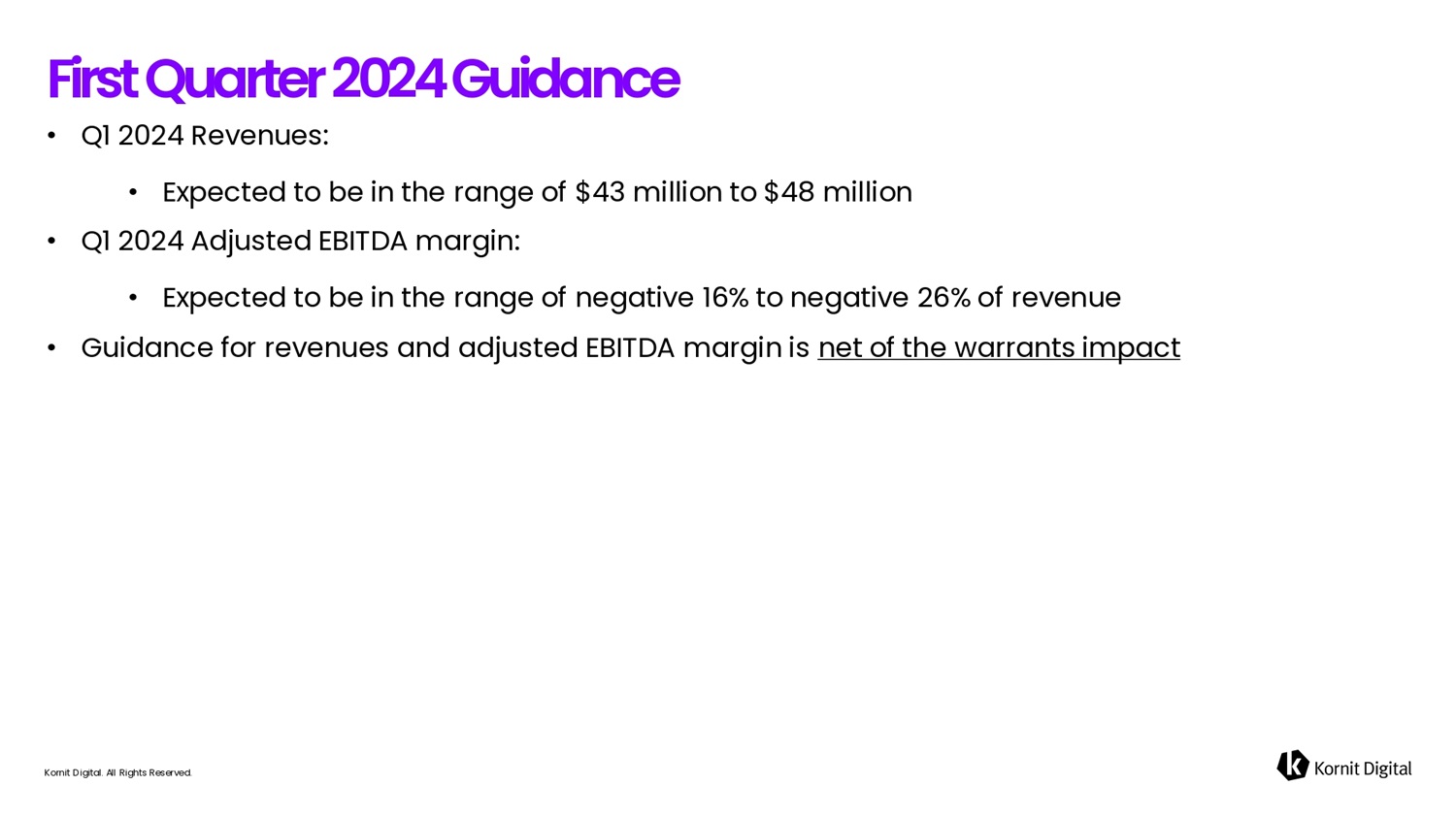 • Q1 2024 Revenues: • Expected to be in the range of $43 million to $48 million • Q1 2024 Adjusted EBITDA margin: • Expected to be in the range of negative 16% to negative 26% of revenue • Guidance for revenues and adjusted EBITDA margin is net of the warrants impact Kornit Digital. All Rights Reserved. F i r s t Qu6rter 2 0 2 4 G u i d6 fi c e