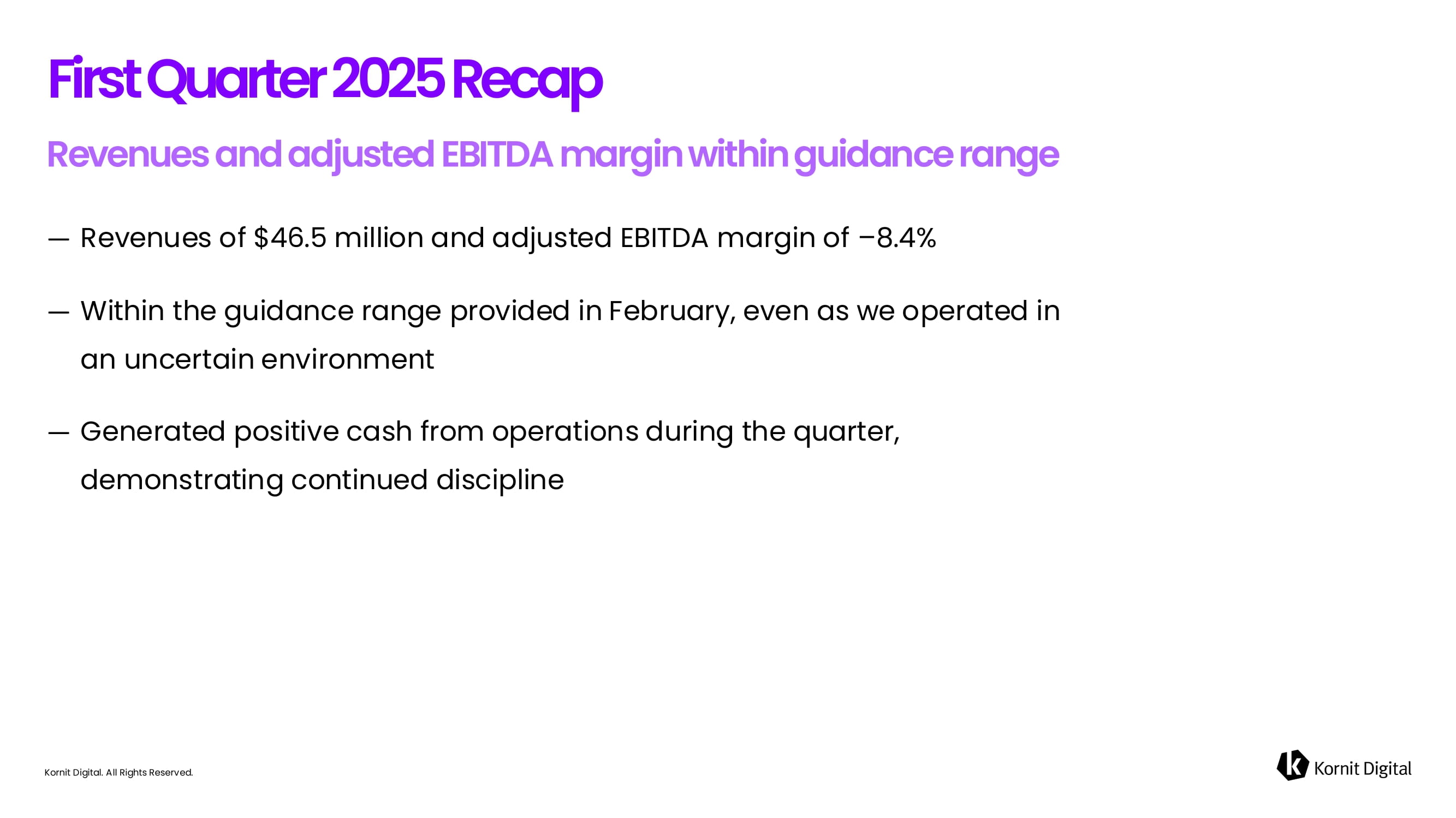 Kornit Digital. All Rights Reserved. ― Revenues of $46.5 million and adjusted EBITDA margin of – 8.4% ― Within the guidance range provided in February, even as we operated in an uncertain environment ― Generated positive cash from operations during the quarter, demonstrating continued discipline First Quarter 2025 Recap