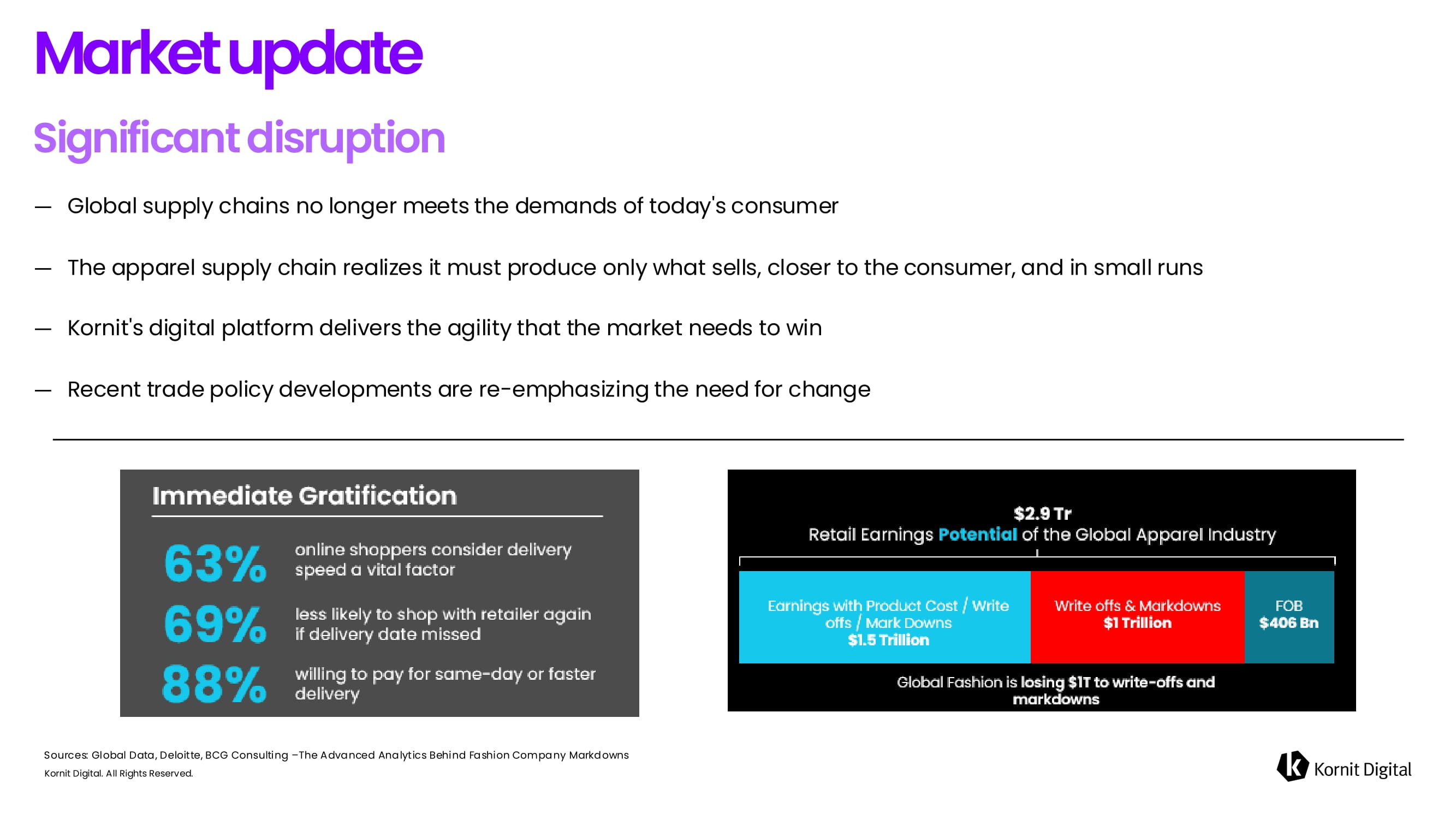 Kornit Digital. All Rights Reserved. ― Global supply chains no longer meets the demands of today's consumer ― The apparel supply chain realizes it must produce only what sells, closer to the consumer, and in small runs ― Kornit's digital platform delivers the agility that the market needs to win ― Recent trade policy developments are re - emphasizing the need for change Market update Sources: Global Data, Deloitte, BCG Consulting – The Advanced Analytics Behind Fashion Company Markdowns