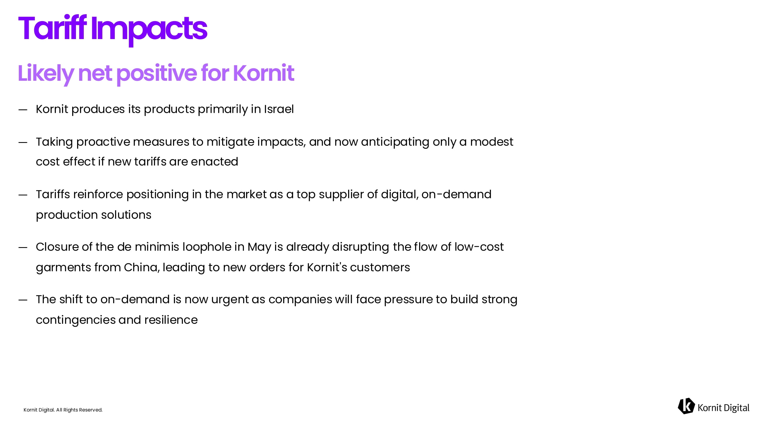 Kornit Digital. All Rights Reserved. ― Kornit produces its products primarily in Israel ― Taking proactive measures to mitigate impacts, and now anticipating only a modest cost effect if new tariffs are enacted ― Tariffs reinforce positioning in the market as a top supplier of digital, on - demand production solutions ― Closure of the de minimis loophole in May is already disrupting the flow of low - cost garments from China, leading to new orders for Kornit's customers ― The shift to on - demand is now urgent as companies will face pressure to build strong contingencies and resilience Tariff Impacts