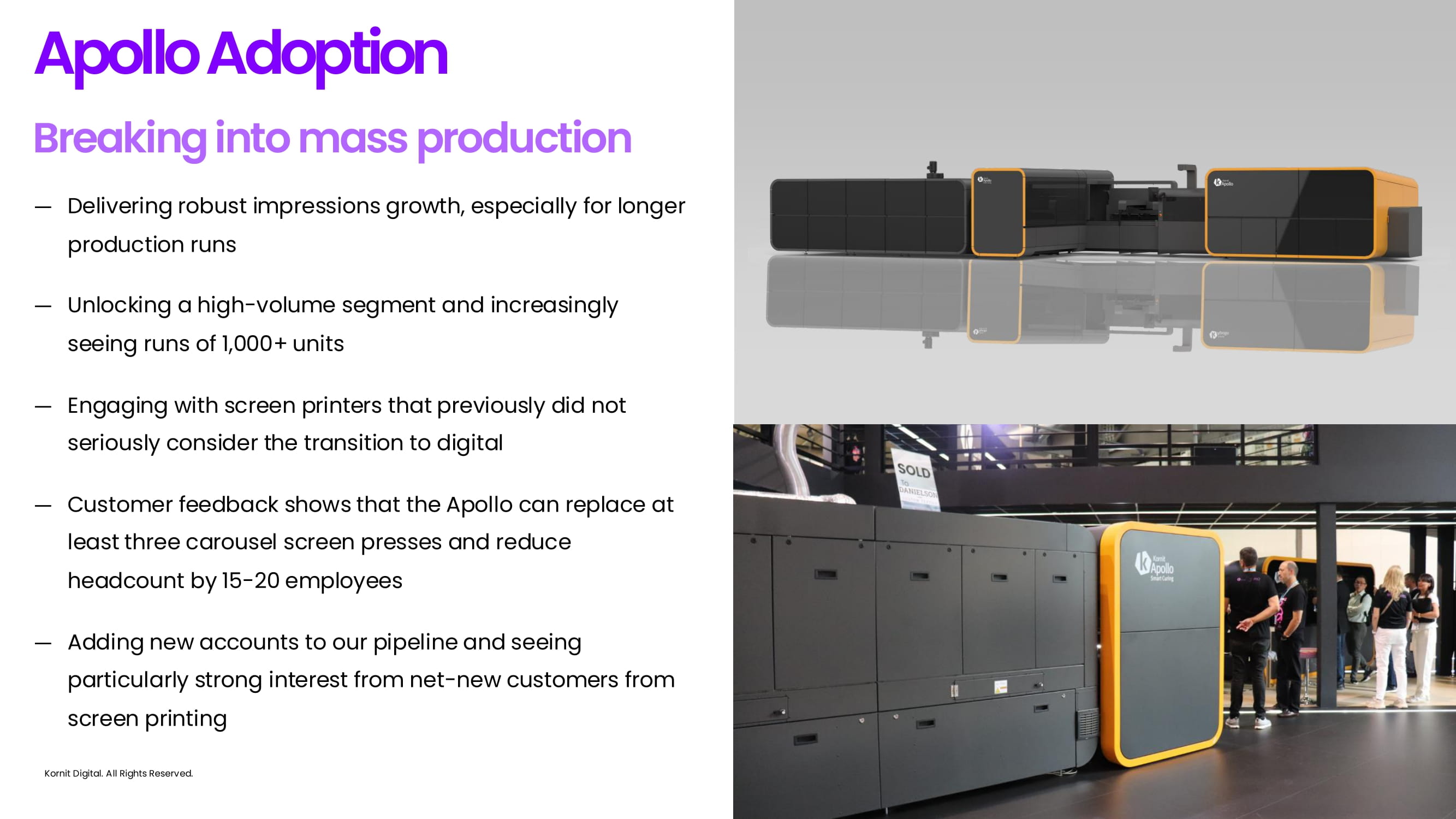 Kornit Digital. All Rights Reserved. ― Delivering robust impressions growth, especially for longer production runs ― Unlocking a high - volume segment and increasingly seeing runs of 1,000+ units ― Engaging with screen printers that previously did not seriously consider the transition to digital ― Customer feedback shows that the Apollo can replace at least three carousel screen presses and reduce headcount by 15 - 20 employees ― Adding new accounts to our pipeline and seeing particularly strong interest from net - new customers from screen printing Apollo Adoption