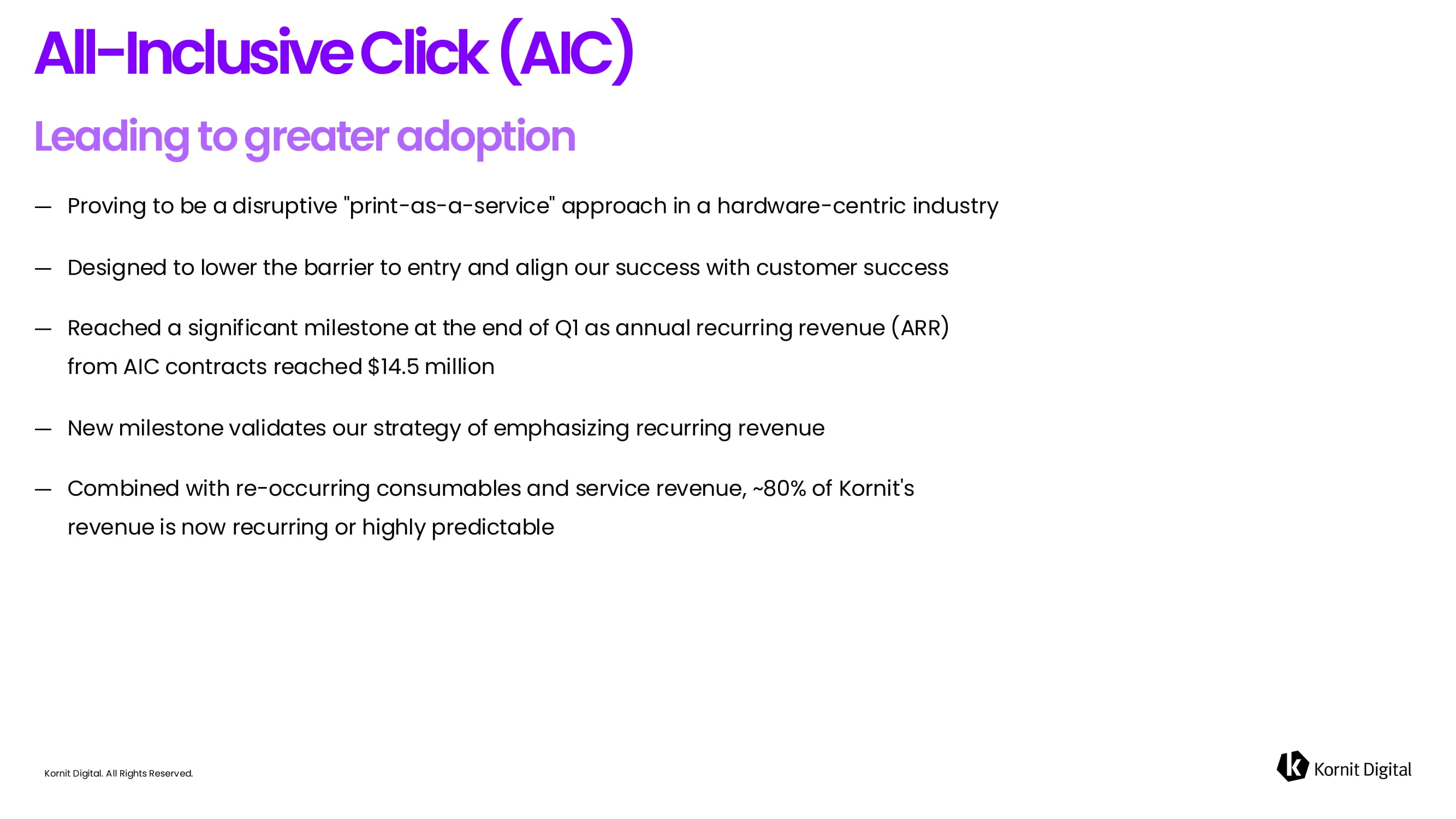 Kornit Digital. All Rights Reserved. ― Proving to be a disruptive "print - as - a - service" approach in a hardware - centric industry ― Designed to lower the barrier to entry and align our success with customer success ― Reached a significant milestone at the end of Q1 as annual recurring revenue (ARR) from AIC contracts reached $14.5 million ― New milestone validates our strategy of emphasizing recurring revenue ― Combined with re - occurring consumables and service revenue, ~80% of Kornit's revenue is now recurring or highly predictable All - Inclusive Click (AIC)